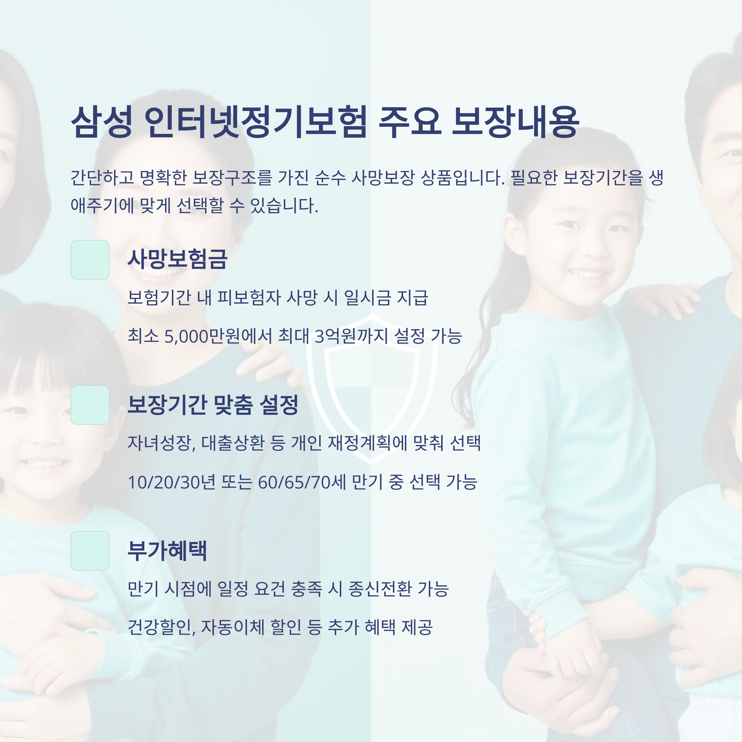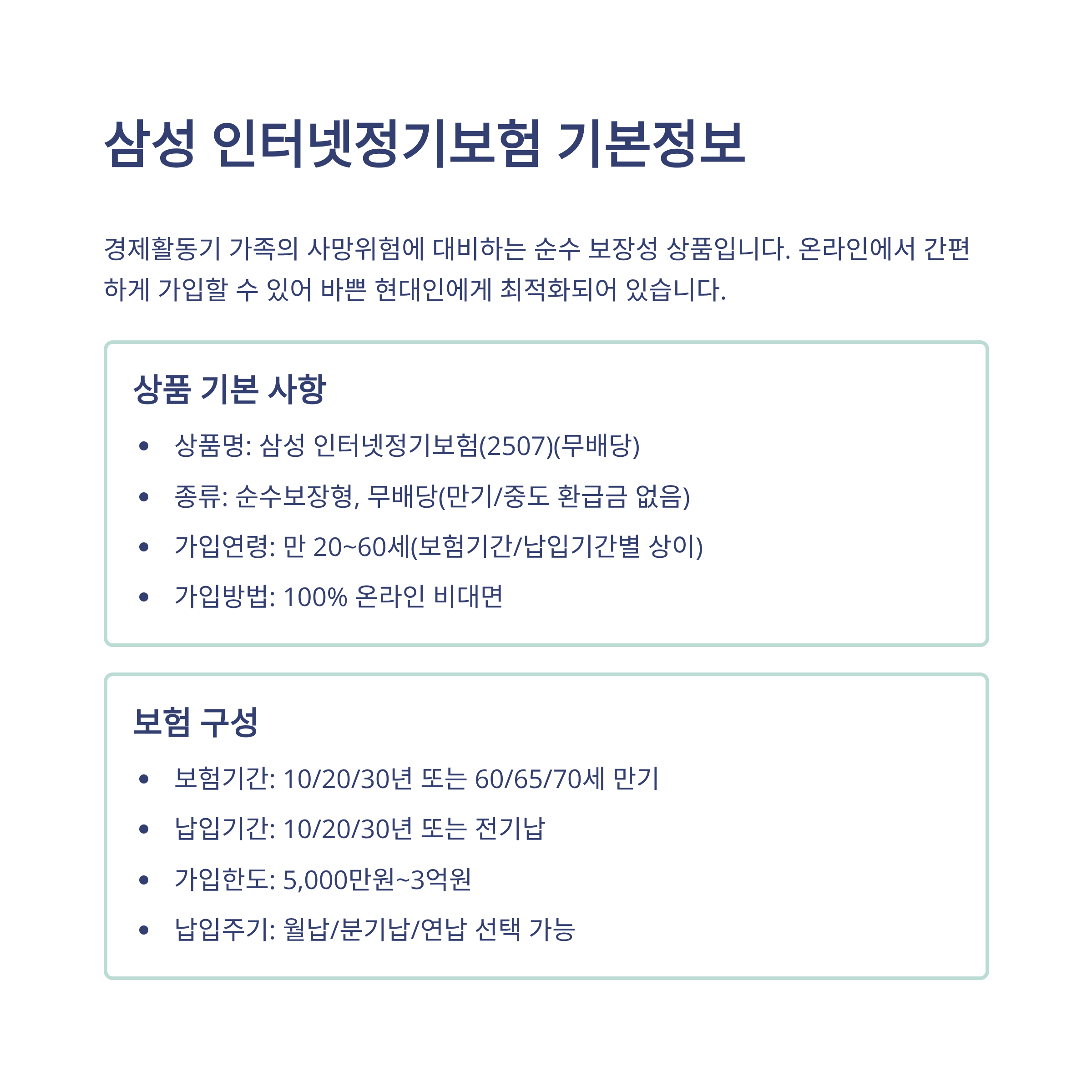 삼성 인터넷정기보험(2507)(무배당)은 삼성생명의 대표적인 온라인 순수보장형 상품이에요. 주계약은 사망보험금 하나로 아주 심플하게 구성되어 있고, 만기환급이 없는 대신 월 보험료가 매우 낮게 책정되어 있어서 젊은 세대부터 50대까지 실속 있게 접근할 수 있습니다.