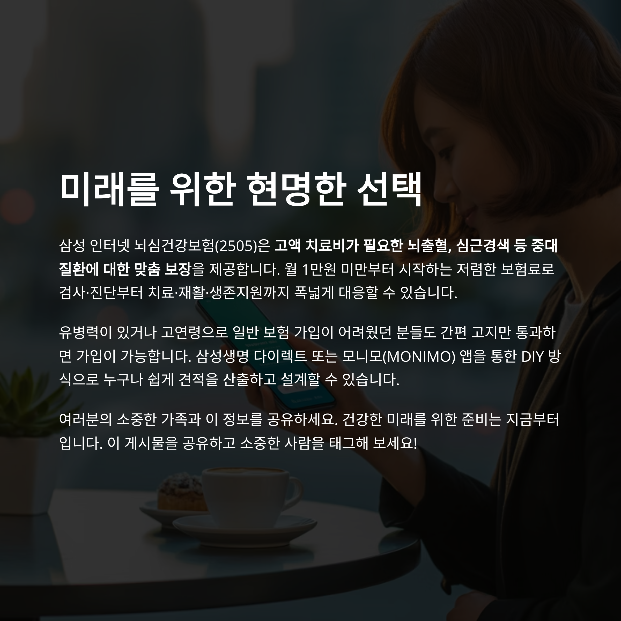 삼성생명에서 선보인 인터넷 뇌심건강보험(2505)(갱신형, 무배당)은 디지털 시대에 맞춰 탄생한 온라인 전용 건강보험입니다. 이름에서 알 수 있듯이 뇌혈관질환(뇌출혈, 뇌경색 등)과 심혈관질환(심근경색, 협심증 등)을 중심으로 보장하며, 삼성생명 다이렉트 홈페이지나 ‘모니모’ 앱을 통해 100% 비대면으로 가입이 가능하죠.