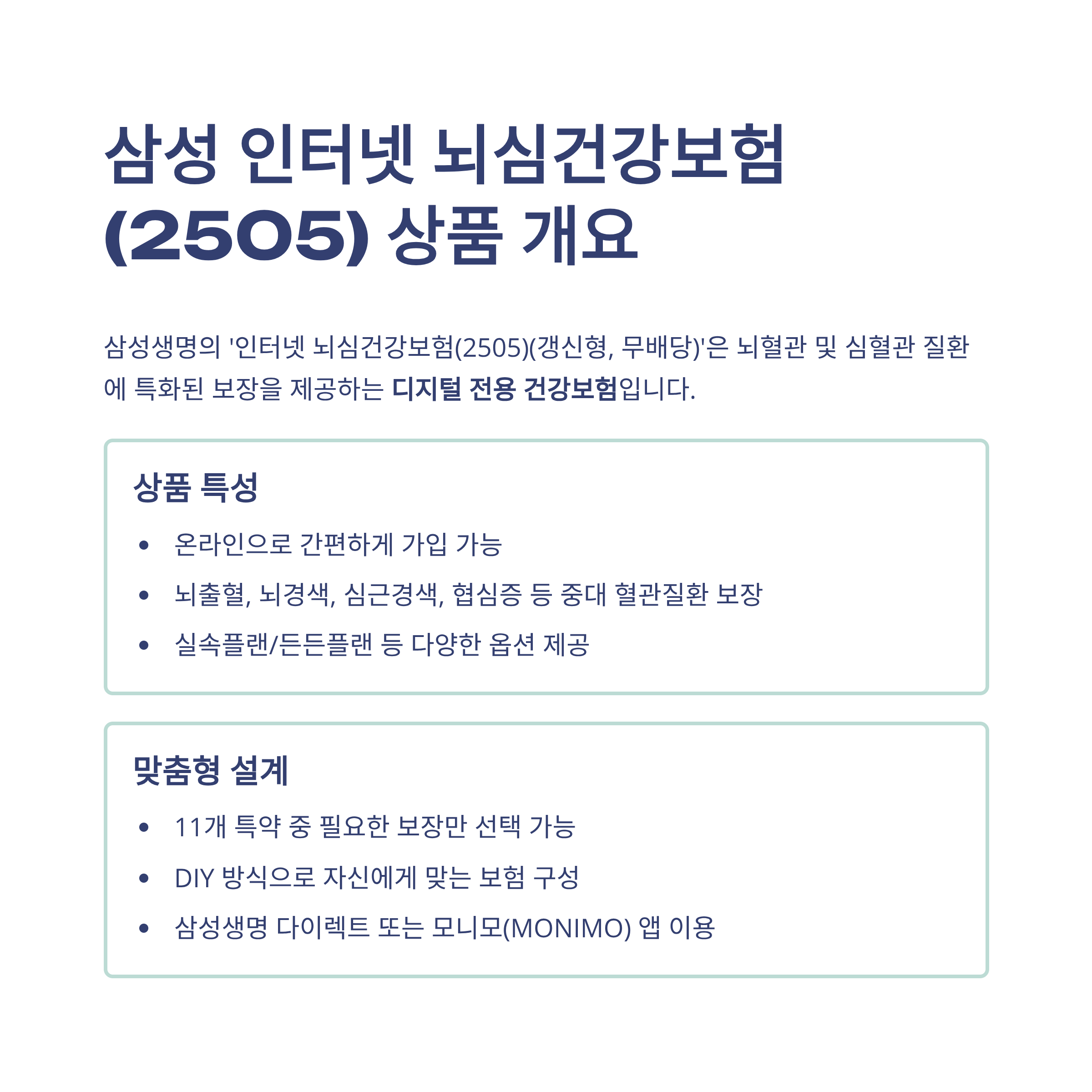삼성생명에서 선보인 인터넷 뇌심건강보험(2505)(갱신형, 무배당)은 디지털 시대에 맞춰 탄생한 온라인 전용 건강보험입니다. 이름에서 알 수 있듯이 뇌혈관질환(뇌출혈, 뇌경색 등)과 심혈관질환(심근경색, 협심증 등)을 중심으로 보장하며, 삼성생명 다이렉트 홈페이지나 ‘모니모’ 앱을 통해 100% 비대면으로 가입이 가능하죠.
