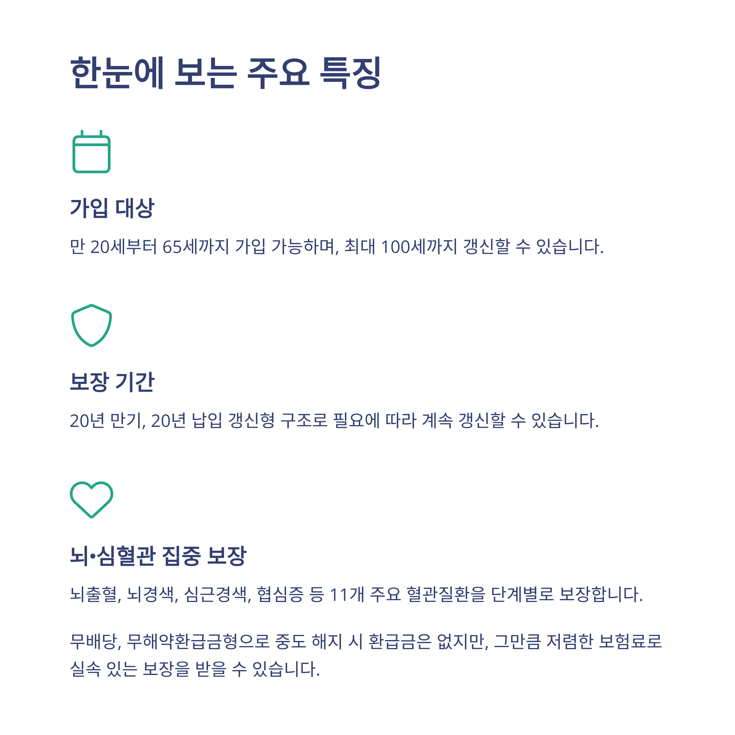 | 보험기간 | 20년 갱신형 (최대 100세까지) |