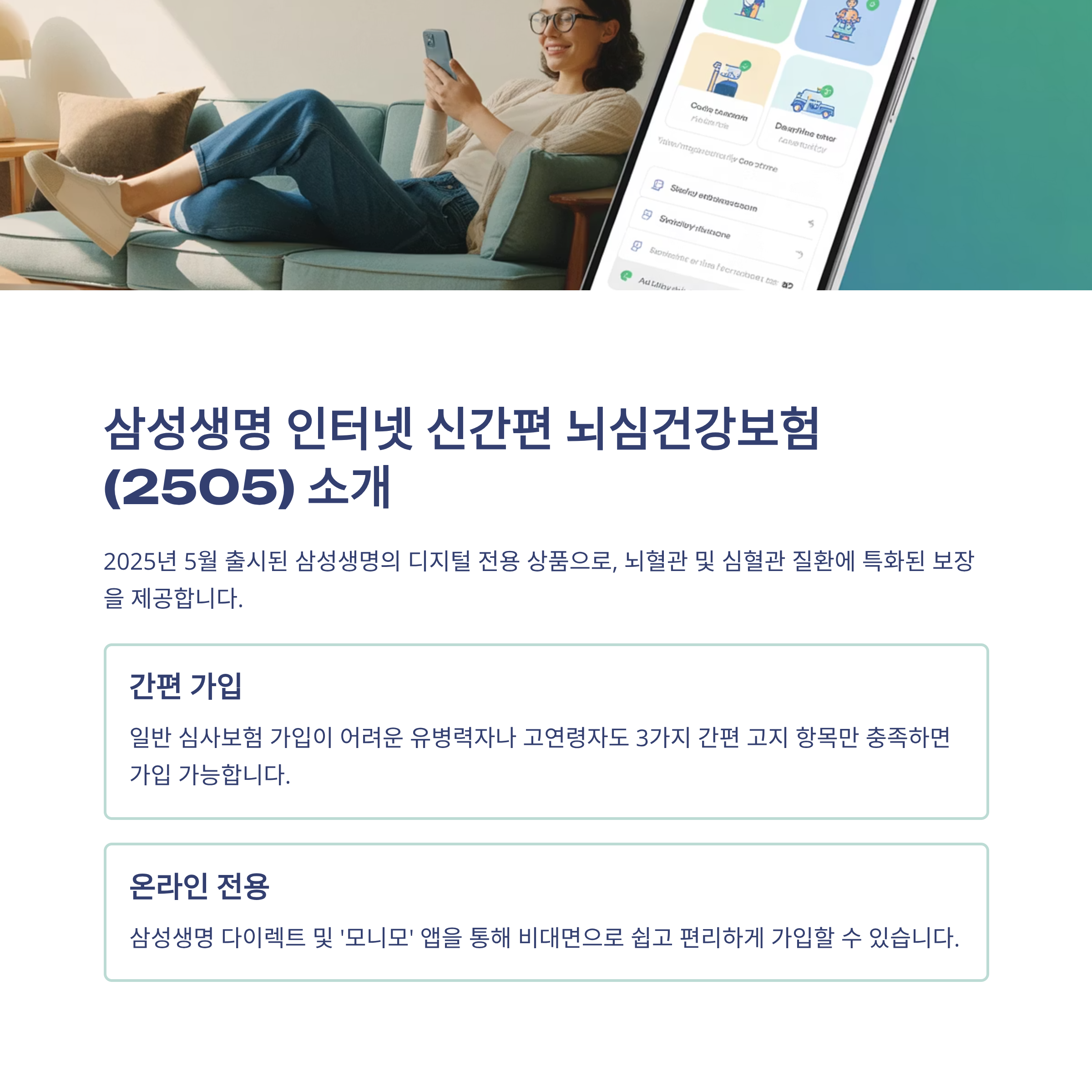 2025년 5월, 삼성생명이 디지털 보험 시장에 강력한 한 방을 던졌습니다. 바로 인터넷 신간편 뇌심건강보험(2505)이란 이름의 온라인 전용 보험인데요. 보험이라고 하면 복잡한 서류, 까다로운 심사, 높은 진입 장벽을 떠올리기 쉬운데 이 상품은 그 모든 걸 최소화한 ‘간편심사형’ 구조입니다.