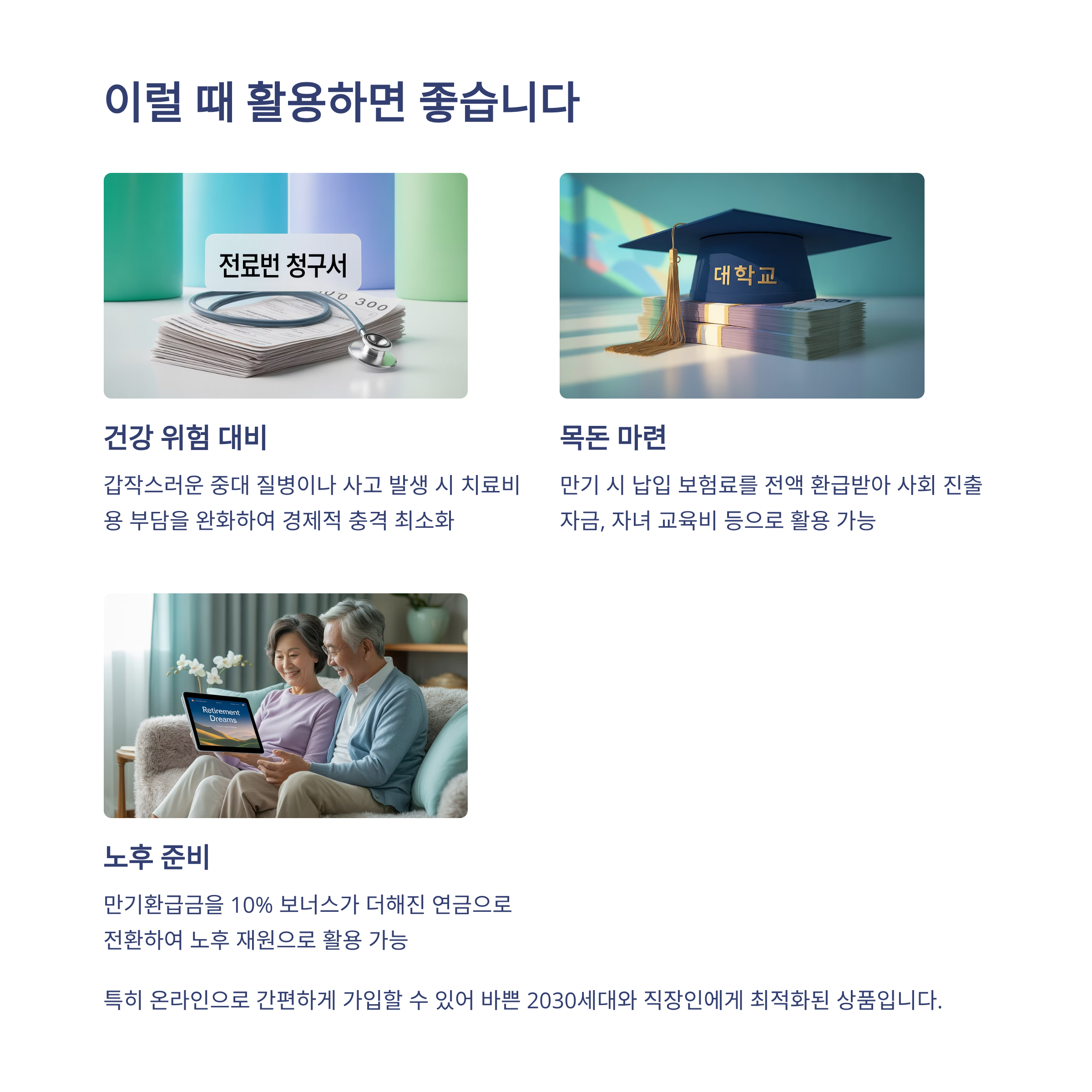 다양한 보장과 만기환급 혜택이 있으니 모든 분들에게 좋겠지만, 특히 다음과 같은 분들에게 적극 추천드려요: