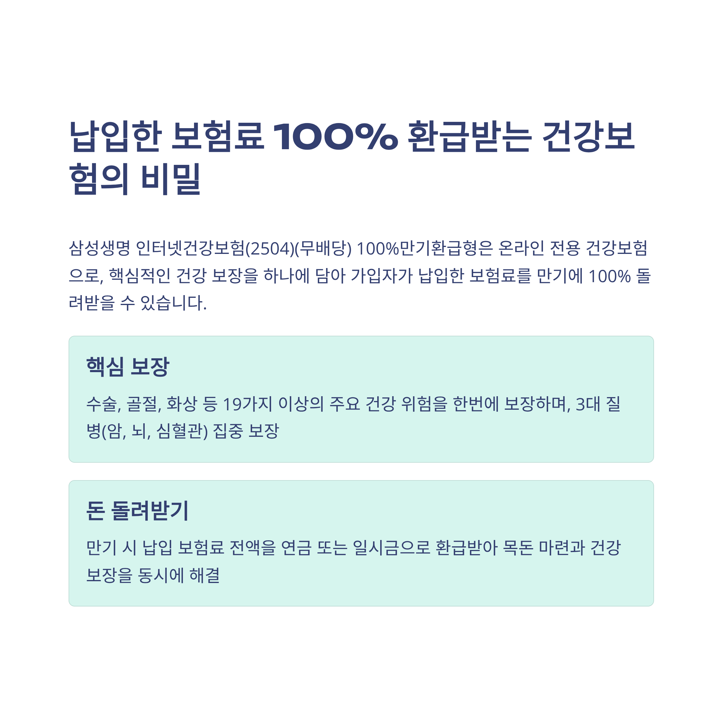 안녕하세요, 여러분! 요즘 주변에서 건강보험 얘기 자주 들리시죠? 저도 얼마 전 친한 친구가 암 수술을 받으면서 ‘진짜 제대로 된 건강보험 하나 들어야겠다’는 생각이 절실히 들었어요. 그런데 그냥 보장만 받는 게 아니라, 납입한 보험료를 100% 돌려준다는 삼성생명 인터넷건강보험(2504)(무배당) 100%만기환급형이라는 상품을 발견했답니다. 마침 월 1만 원대부터 시작할 수 있고, 온라인으로 간편하게 가입할 수 있어서 요즘 트렌드에도 딱이더라고요. 오늘은 저처럼 건강도 지키고, 돈도 아끼고 싶은 분들을 위해 이 상품을 좀 더 자세히 들여다보려고 해요!