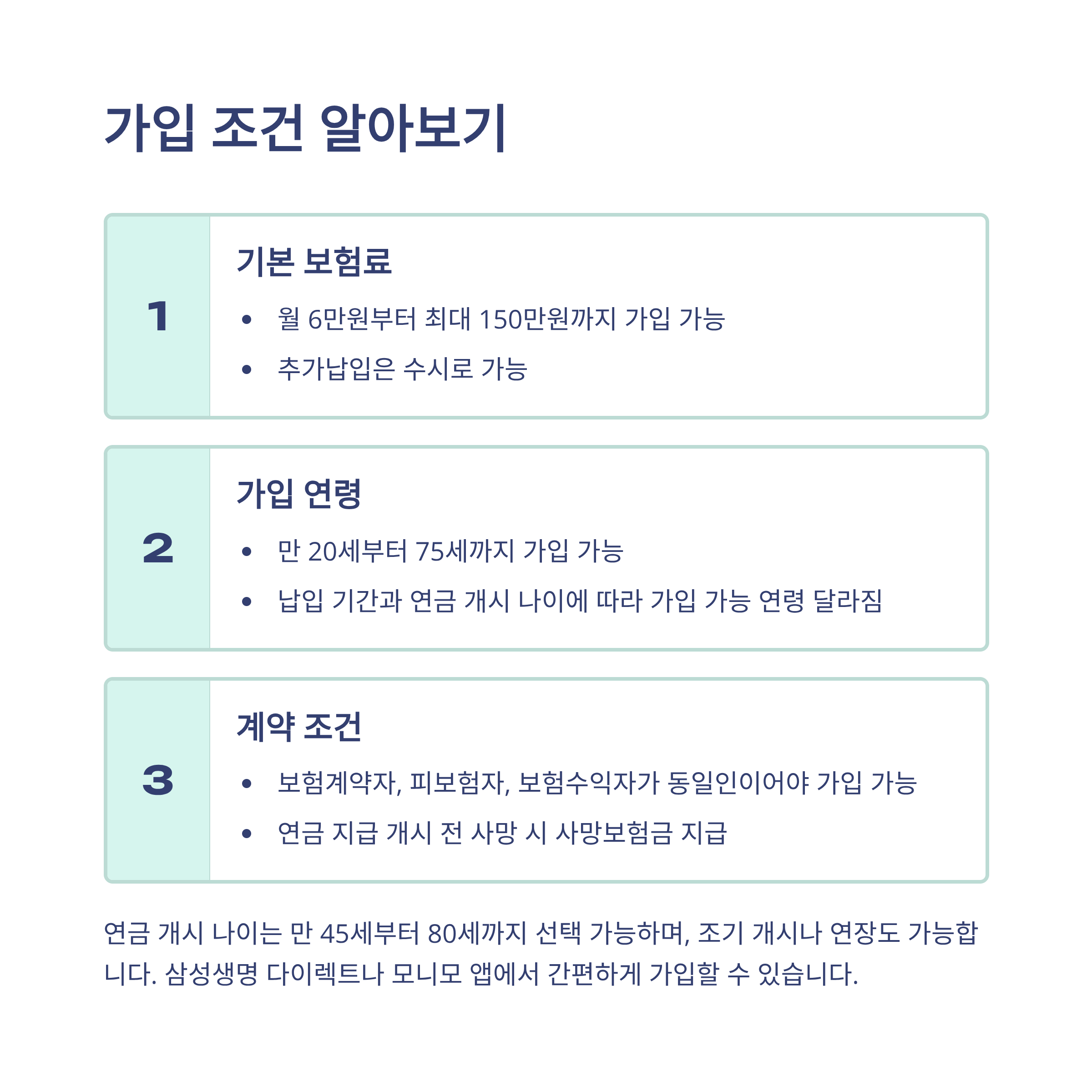 가입하기 전에 꼭 알아둬야 할 조건들이 있어요. 특히 연금 개시 나이와 보험료 납입 기간에 따라 가입 가능한 연령이 달라지기 때문에 체크가 필요하죠.