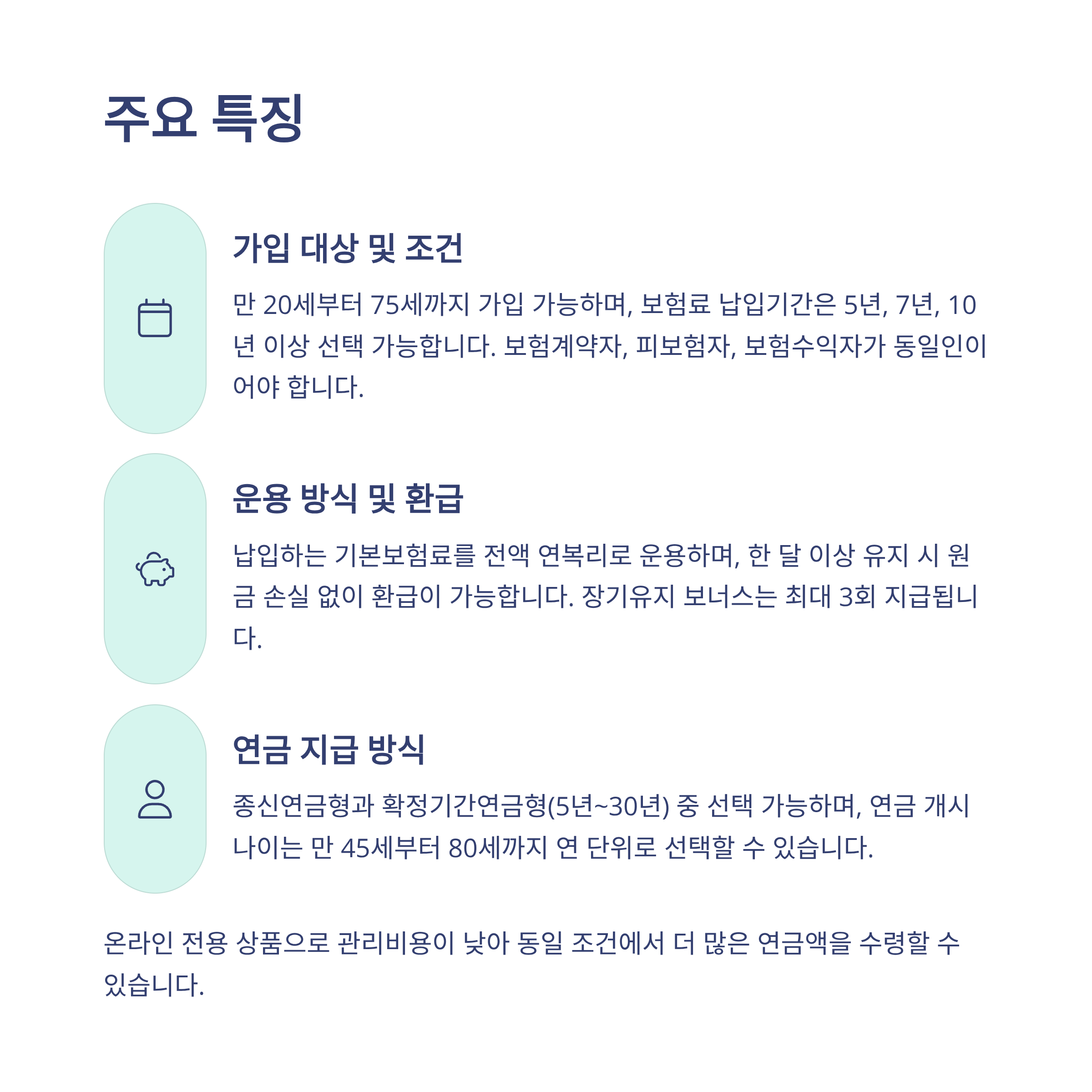 가입은 만 20세부터 75세까지 가능하고, 납입 기간은 최소 5년부터 시작해요. 보험계약자와 피보험자가 동일해야 가입할 수 있는 구조라서 실제로 ‘내 노후’를 위해 가입하는 사람에게 딱 맞아요. 기본보험료는 월 6만 원부터 시작할 수 있으니 진입장벽도 낮은 편이구요.