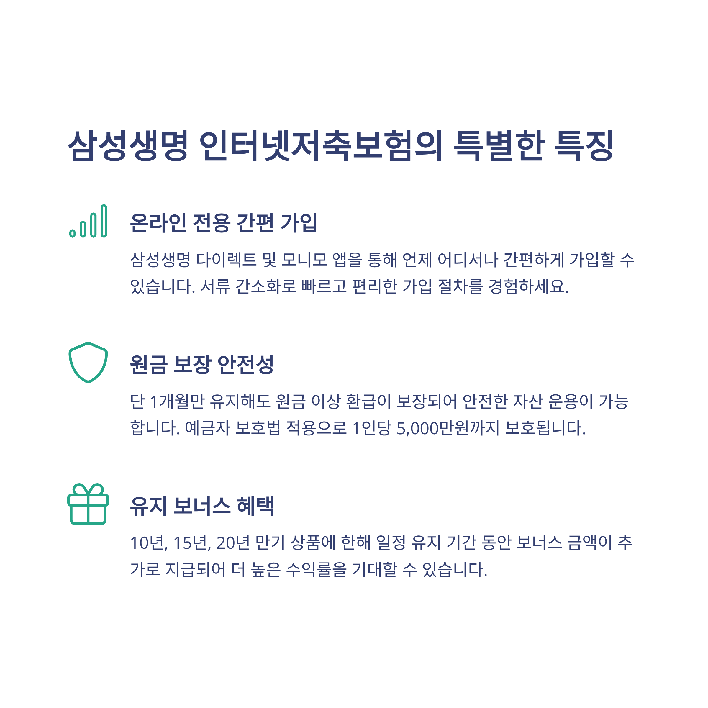 삼성생명의 인터넷저축보험(2501)(무배당)은 요즘 소비자들이 정말 좋아할 만한 ‘안정+보장+편리함’이라는 3박자를 모두 갖춘 저축보험이에요. 온라인 전용 상품이라 오프라인보다 관리비용도 확실히 절감되고요. 1개월만 유지하면 원금 손실 없이 해지가 가능하다는 점도 진짜 매력 포인트!