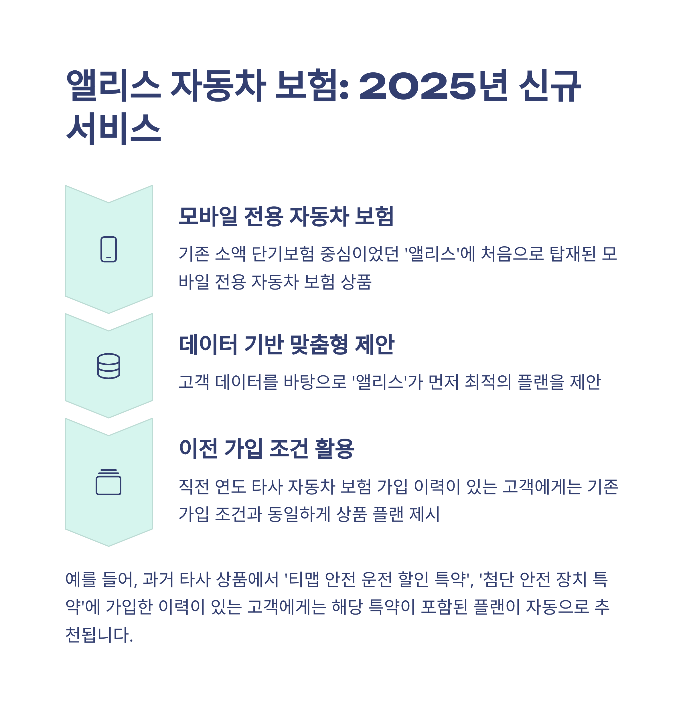 이 상품은 기존에 소액 단기보험만 제공하던 '앨리스' 플랫폼에 처음으로 도입된 자동차보험으로, 고객 데이터를 바탕으로 한 맞춤형 추천 기능이 가장 큰 특징이에요.