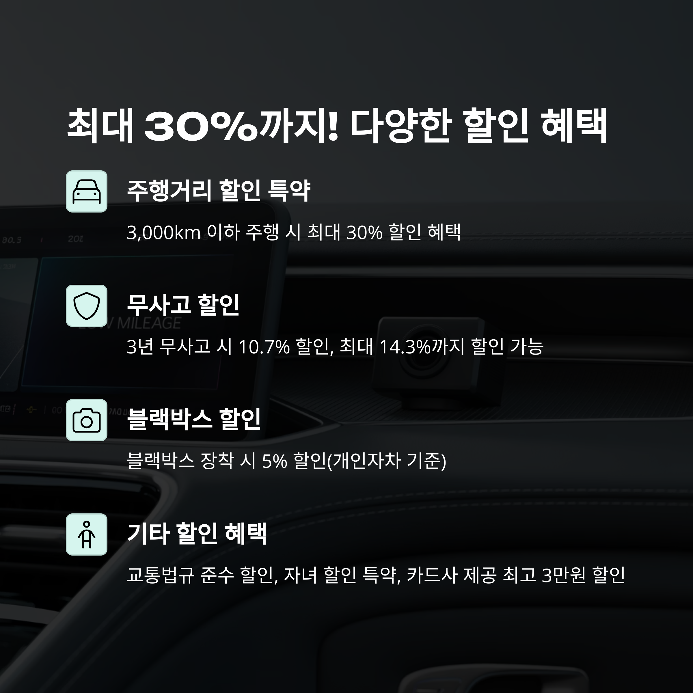 | 주행거리 특약 | 연간 3,000km 이하 주행 시 최대 30% 할인 |