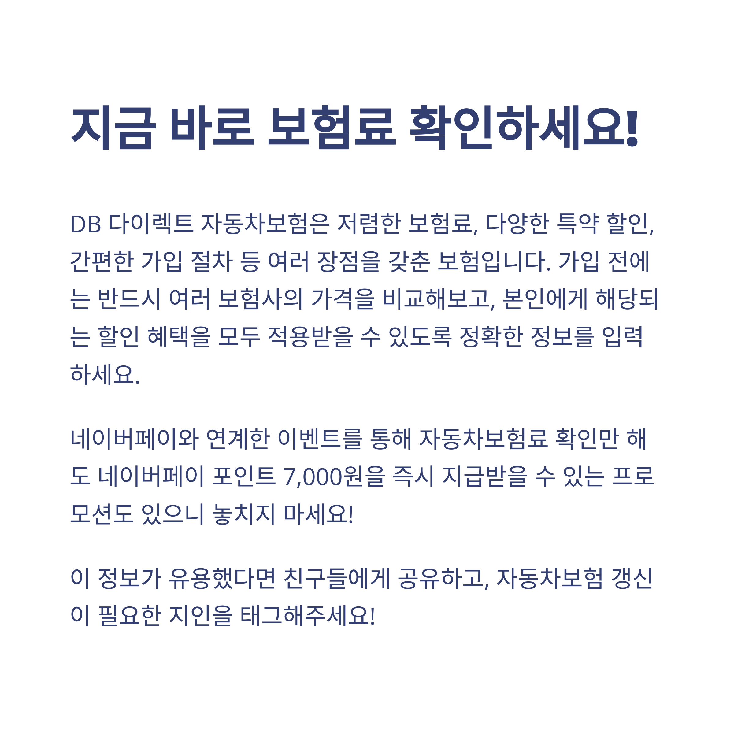 지금 보험 갱신을 앞두고 계시다면, 한 번쯤 DB 다이렉트 자동차보험을 꼭 비교해보시길 추천드립니다.