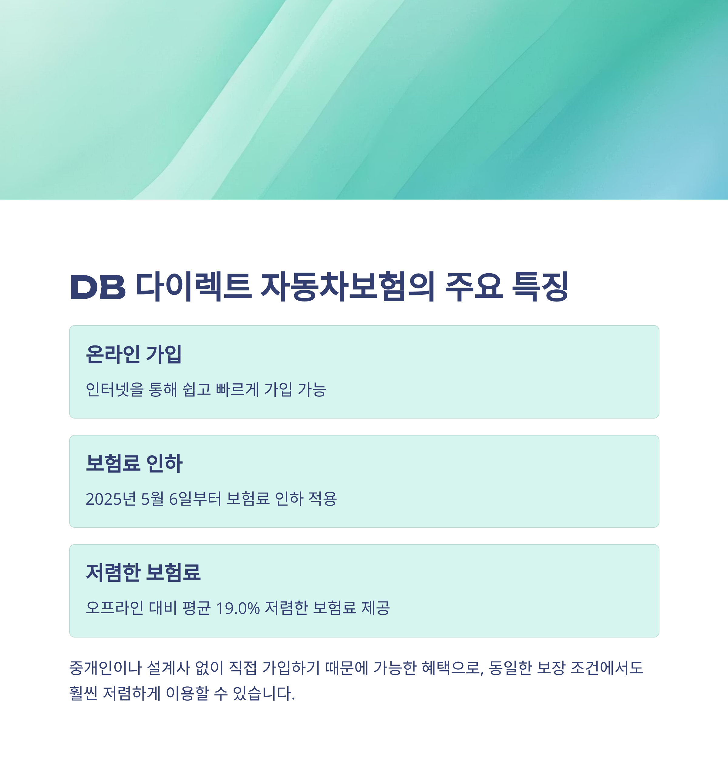 DB 다이렉트 자동차보험은 인터넷을 통해 누구나 간편하게 가입할 수 있는 온라인 전용 자동차보험입니다. 중개인이나 설계사 없이 직접 가입하는 구조 덕분에 평균적으로 오프라인 대비 19.0% 더 저렴한 보험료가 가능하죠. 특히 2025년 5월 기준으로 보험료가 또 한 번 인하되면서, 가성비를 따지는 운전자들에게는 더할 나위 없는 선택이 되고 있어요. 인터넷 가입 시에는 최대 17.7%의 할인까지 받을 수 있다는 점도 주목할 만합니다.