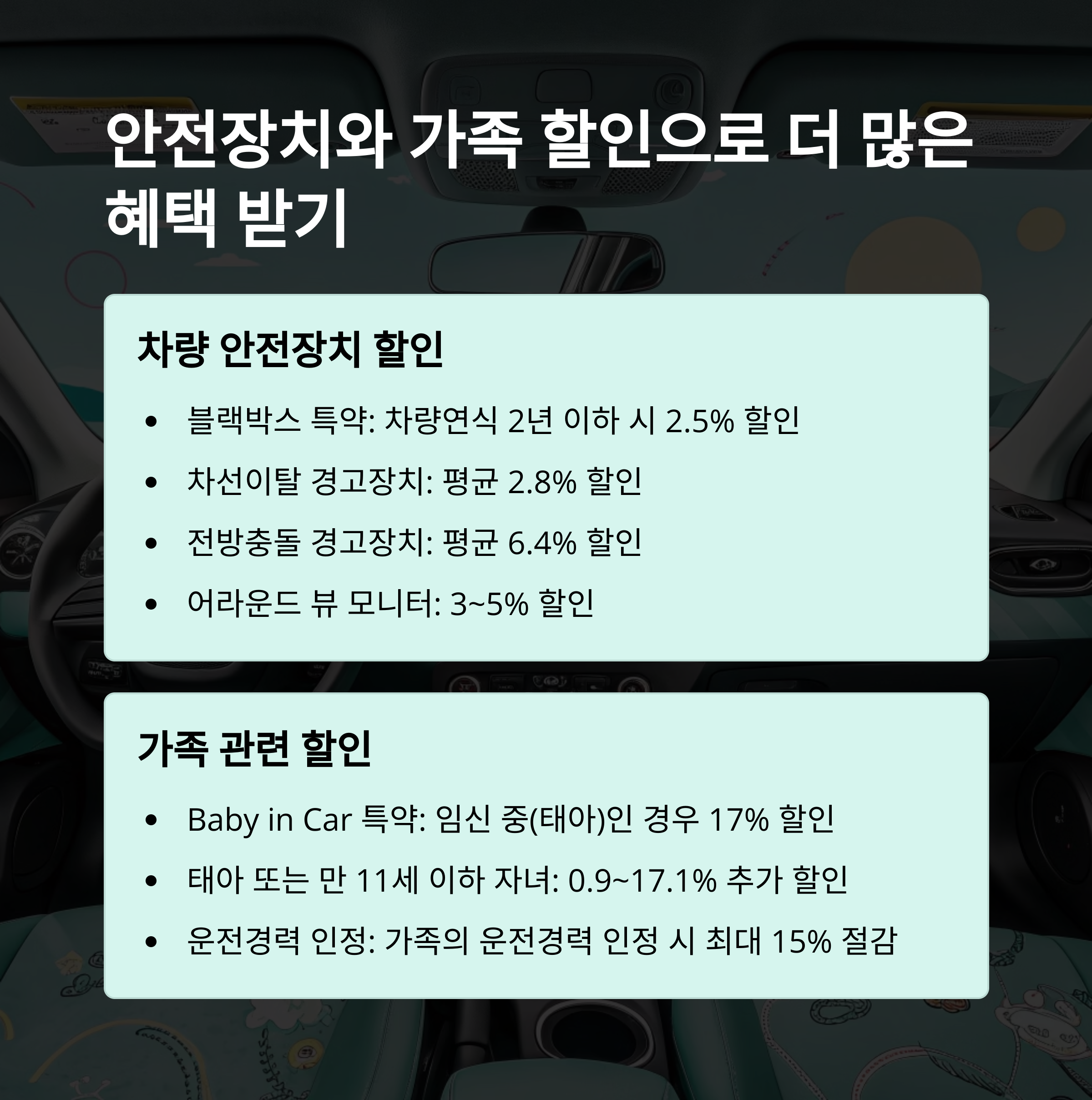 - 블랙박스/차선이탈 경고 장치 장착: 평균 2.5~6.4% 할인
