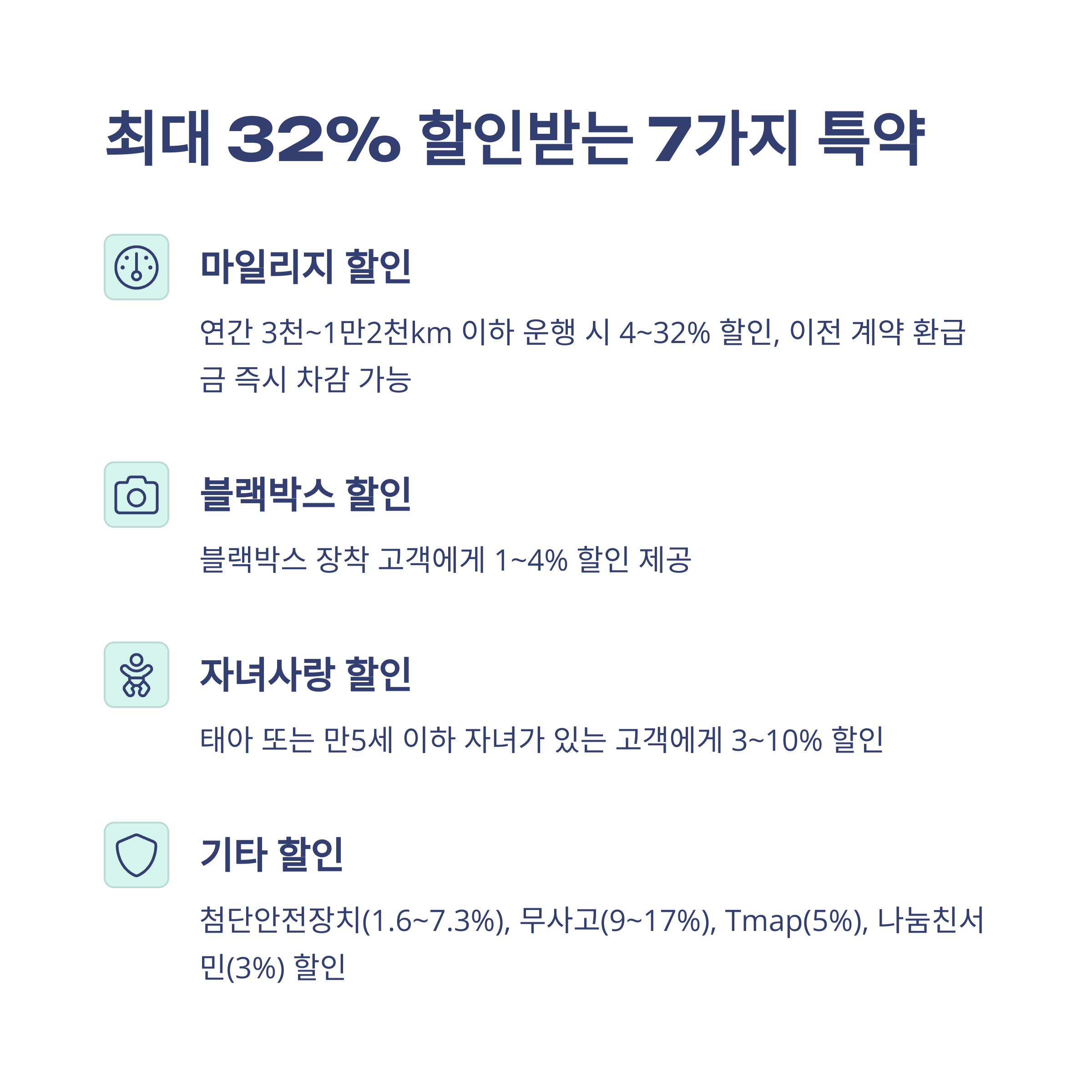 - 마일리지 특약: 연 12,000km 이하 운전자 최대 32% 할인
