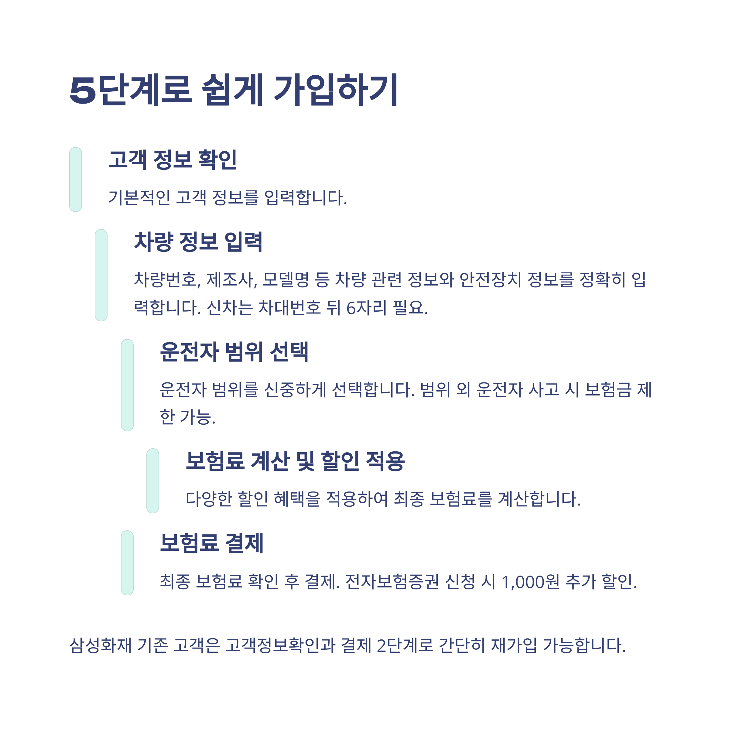 삼성 다이렉트 자동차보험의 가입 절차는 예상보다 훨씬 간단해요. 특히 재가입은 단 2단계면 완료되니 놀라울 정도죠. 신규 가입자 기준으로는 고객정보 입력 → 차량 정보 입력 → 운전자 범위 설정 → 보험료 계산 → 결제까지 총 5단계로 진행됩니다. 신차일 경우엔 차대번호 뒷자리만 입력해도 정보가 자동 조회돼 편리함을 더해요.