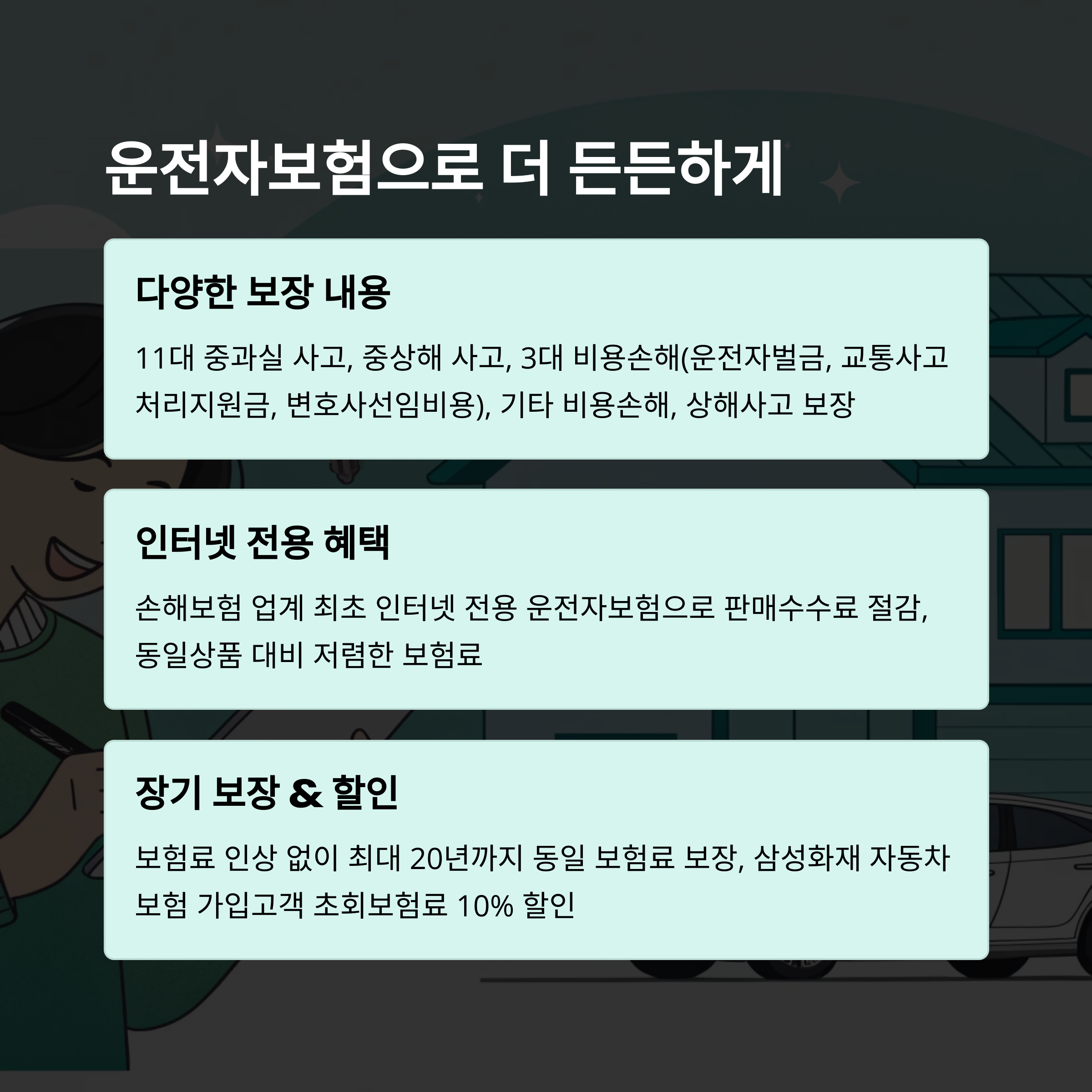 자동차보험으로는 커버되지 않는 '운전자 본인 책임'에 대한 보장은 삼성 다이렉트 운전자보험이 도맡습니다. 사고처리지원금, 벌금, 변호사 선임비용 등 실질적인 금전적 부담을 줄여주는 똑똑한 보장 설계예요. 특히 이 보험은 손보업계 최초의 ‘인터넷 전용 상품’이라 판매 수수료가 없어 가성비가 뛰어난 점도 매력 포인트입니다.