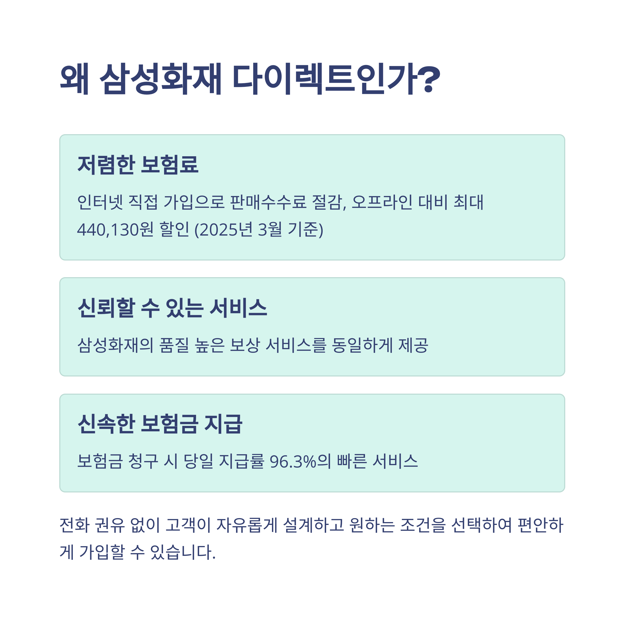 삼성화재 다이렉트는 누구나 쉽게 설계할 수 있도록 UI/UX가 최적화되어 있어요. 별도 전화 권유 없이도 원하는 보장을 직접 선택할 수 있고, 고객센터도 잘 운영되고 있어요.