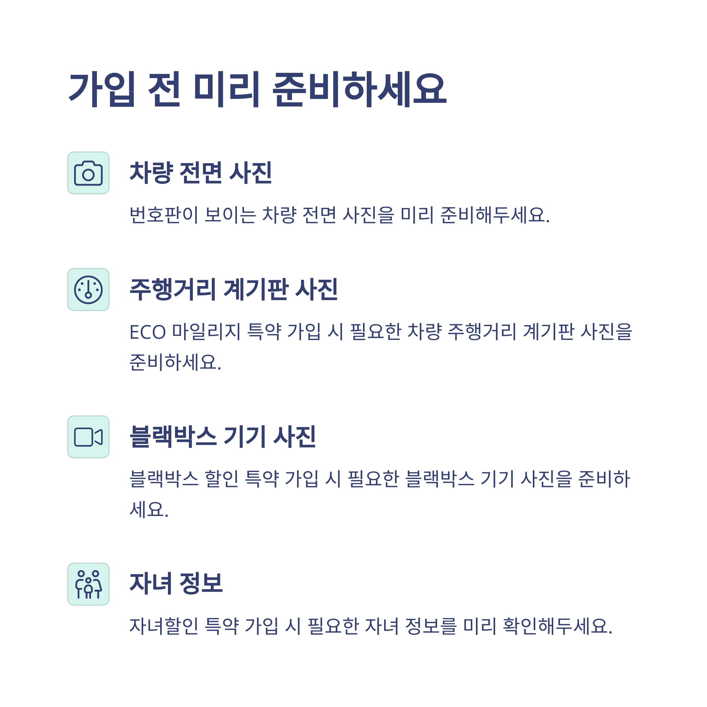 가입 전에 몇 가지 자료만 준비해두면 가입이 훨씬 수월해져요. 특히 할인 특약을 제대로 활용하려면 필요한 사진이나 정보가 꽤 있거든요. 준비물 체크리스트로 정리해볼게요.