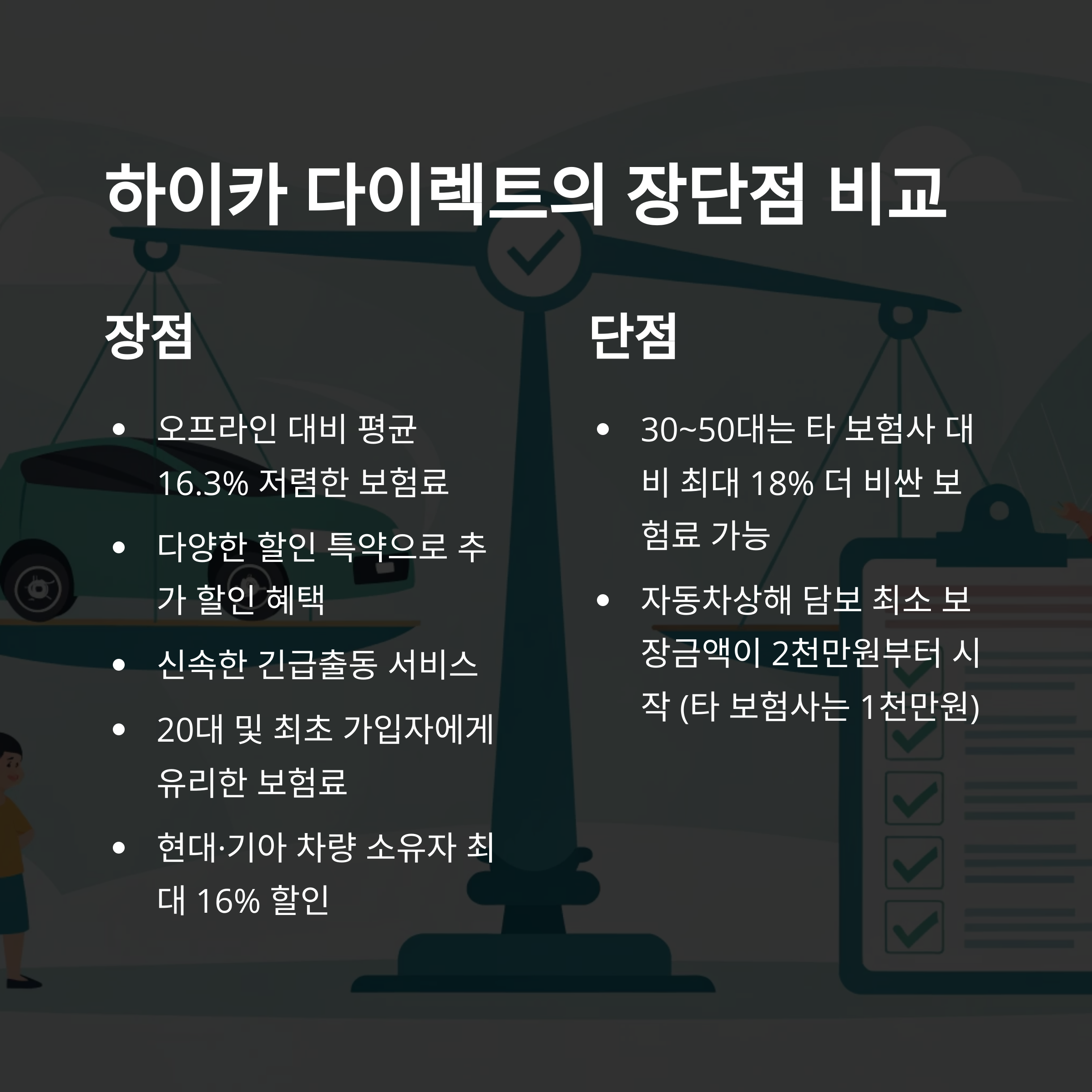 모든 보험이 그렇듯, 하이카 다이렉트도 장단점이 있어요. 아래 테이블에 간단히 정리해볼게요.