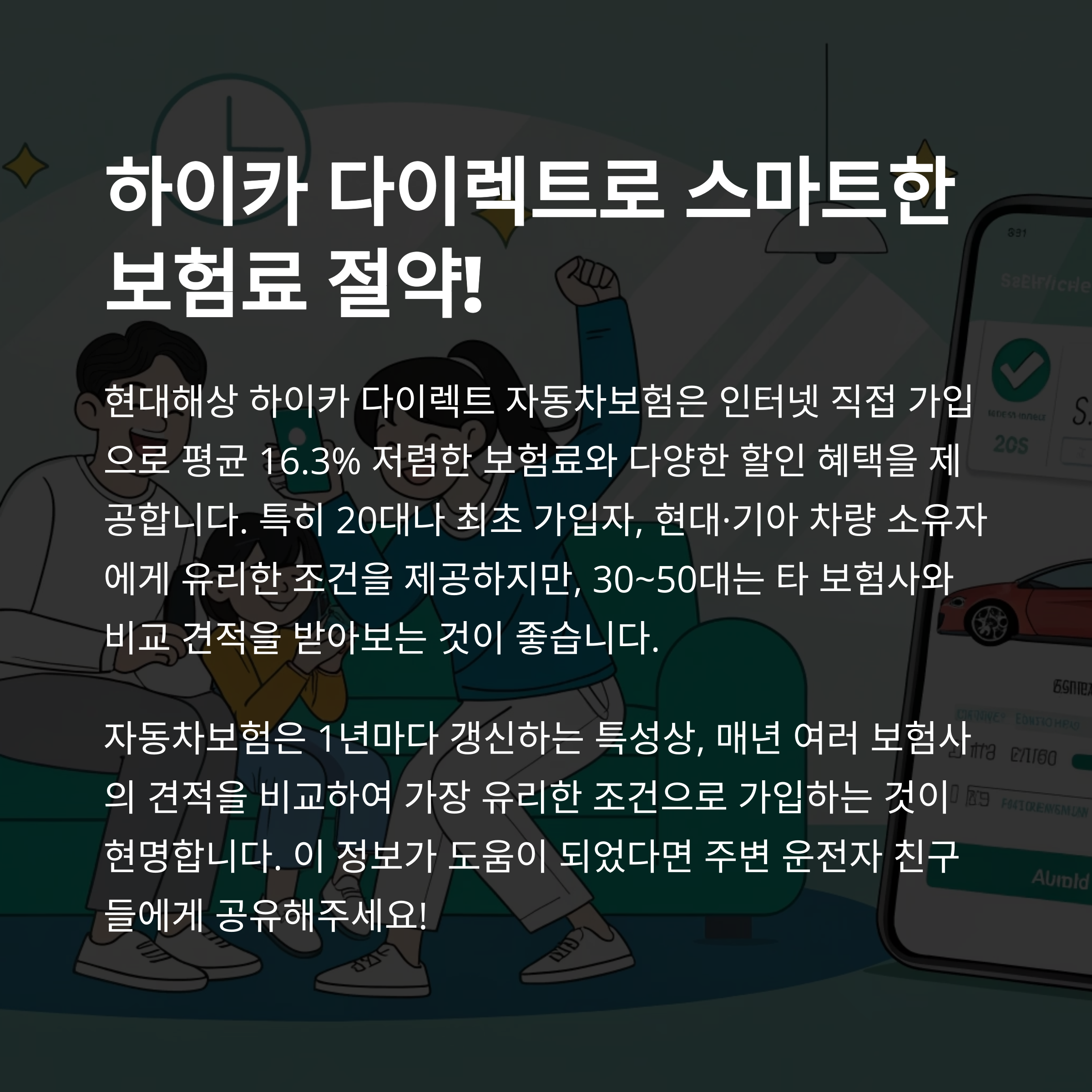 이렇게 하이카 다이렉트 자동차보험에 대해 쭉 살펴봤는데요, 여러분에게 조금이나마 도움이 되었길 바랍니다. 자동차보험은 매년 갱신해야 하는 만큼, 그때그때 조건에 따라 유리한 상품을 선택하는 게 정말 중요해요. 특히 다이렉트 보험은 가입자 스스로 정보를 잘 파악하고 특약을 제대로 챙겨야 하니, 오늘 알려드린 내용 잘 참고하셔서 꼭 알뜰하게 가입하시길 바랄게요. 그리고 혹시 경험담이나 궁금한 점이 있다면 댓글로 남겨주세요. 함께 이야기 나눠보아요!