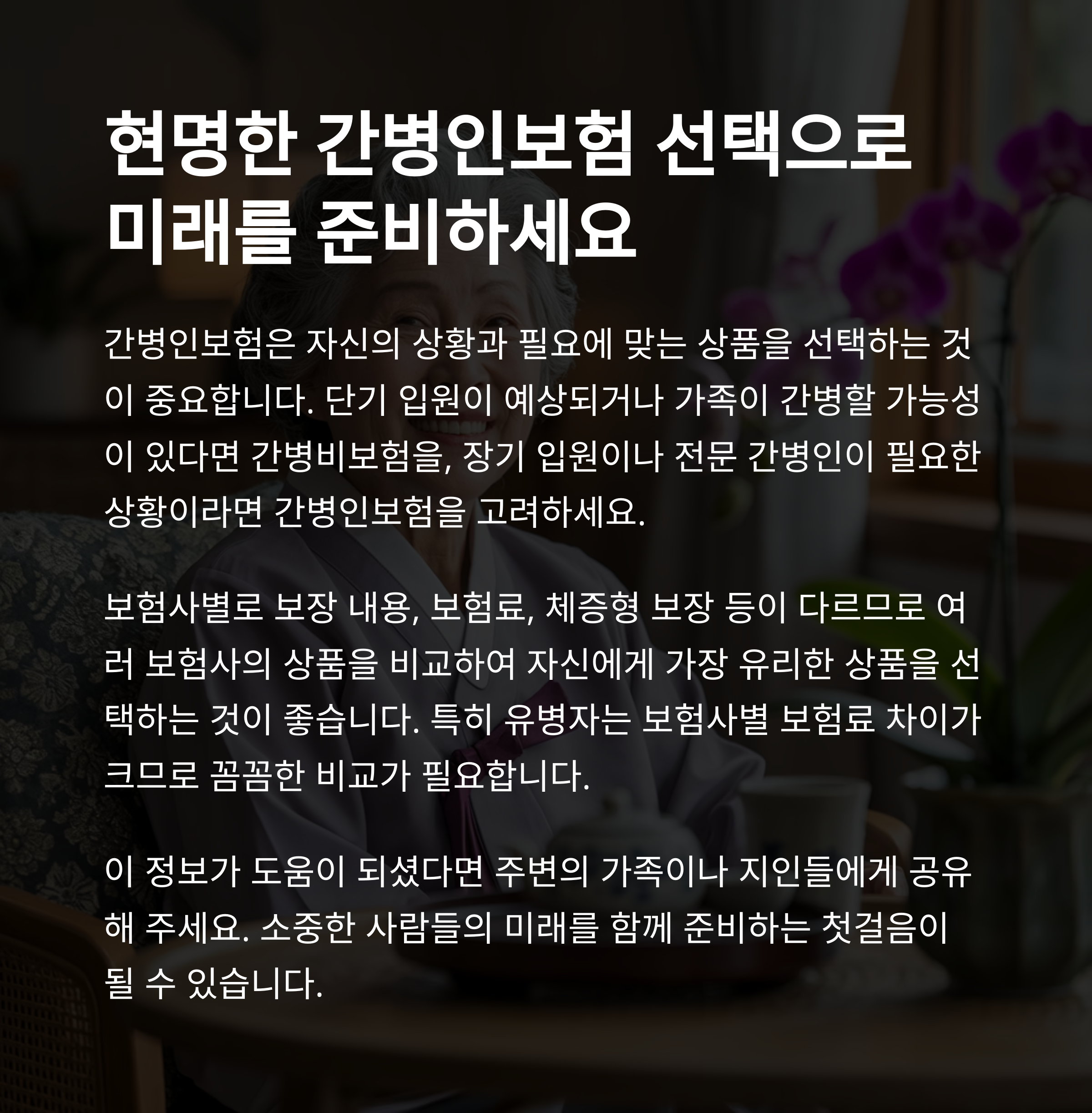 오늘은 간병인보험의 종류부터 보험사별 특징, 그리고 상황별 추천까지 꼼꼼히 살펴보았어요.