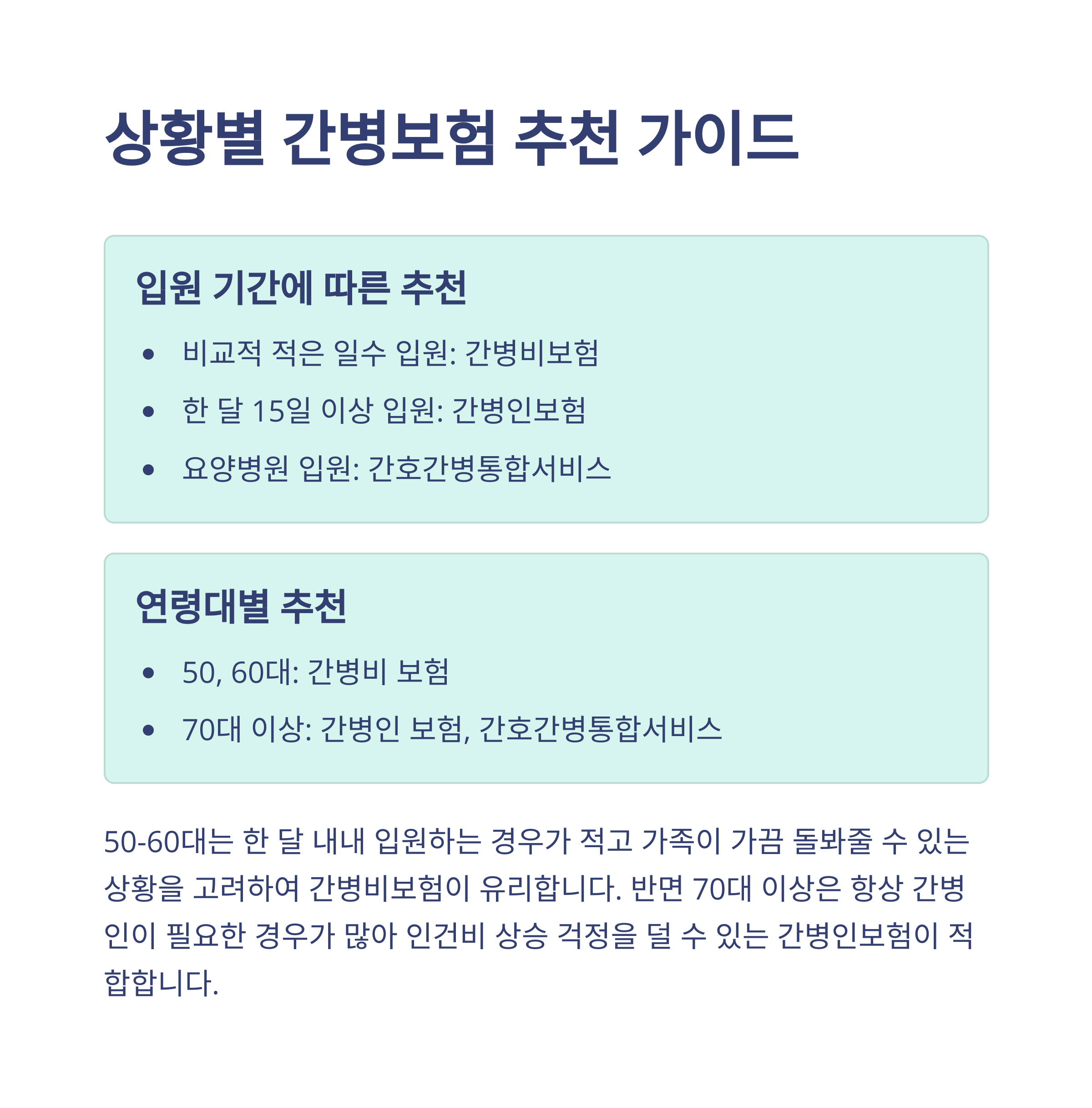 • 70대 이상: 간병인 인건비 걱정 줄이기 위해 간병인보험 추천