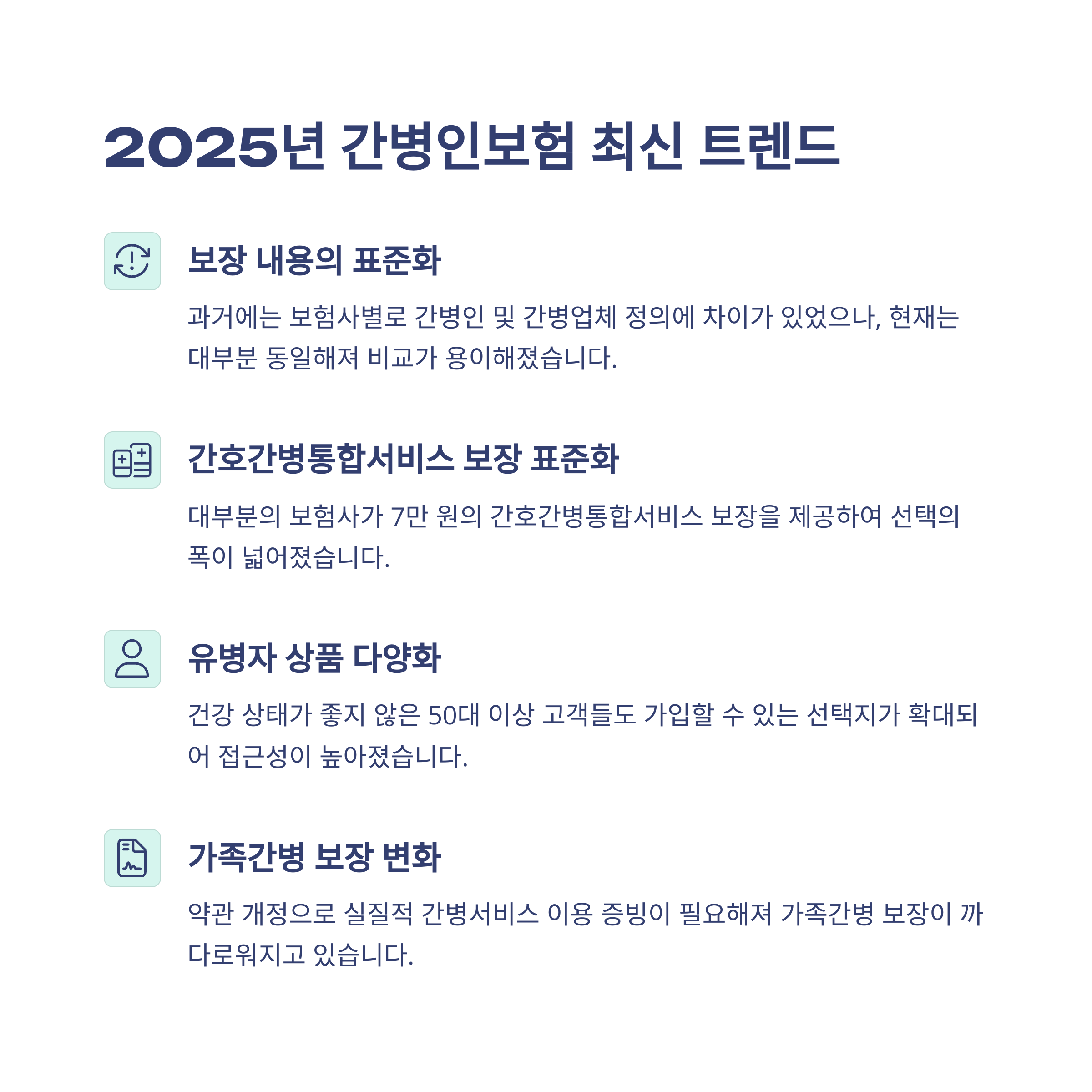 • 보장 표준화: 간병인 정의 및 보장 구조가 통일되는 추세