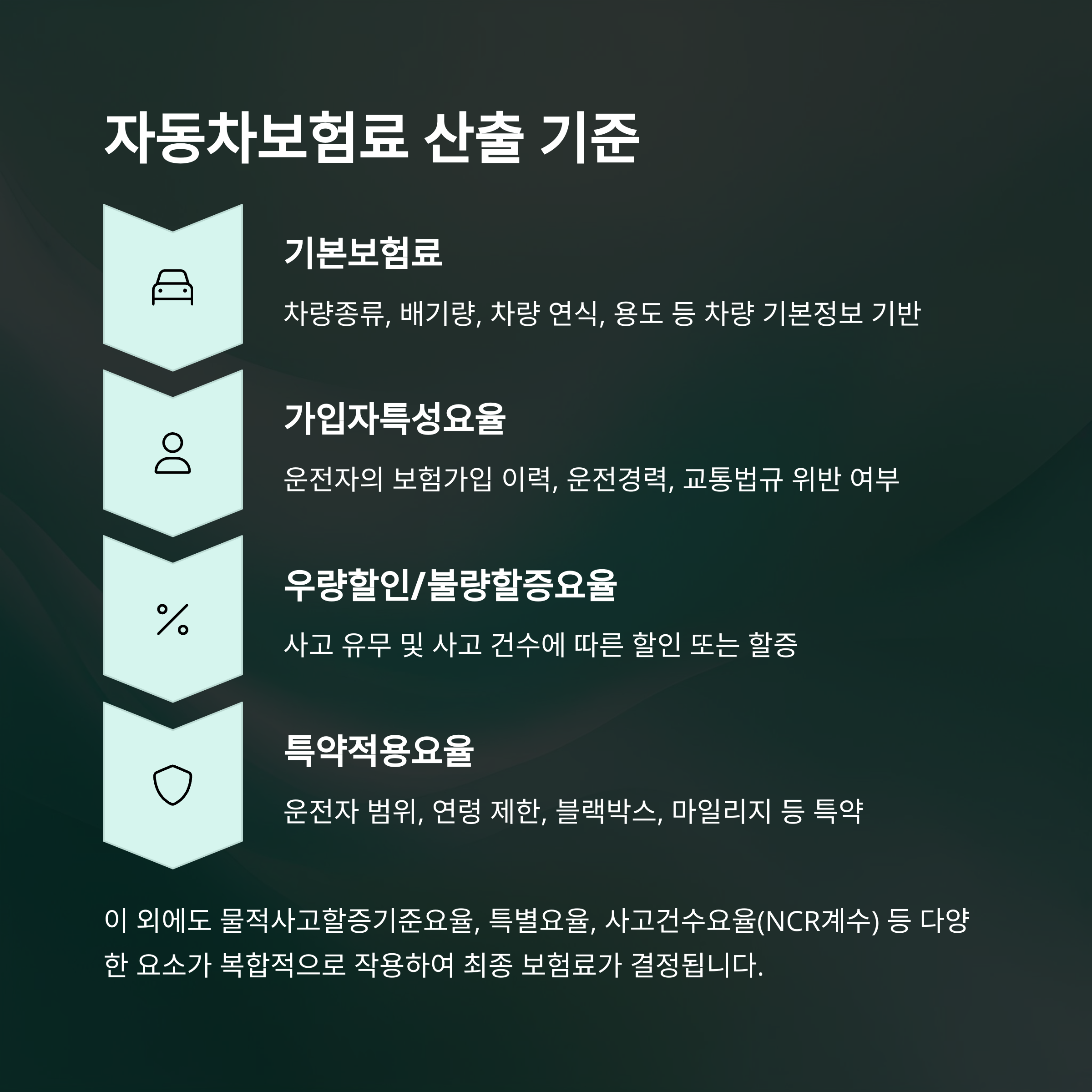 | 기본보험료 | 차량종류, 배기량, 연식, 용도 등 기본 정보 기반 |