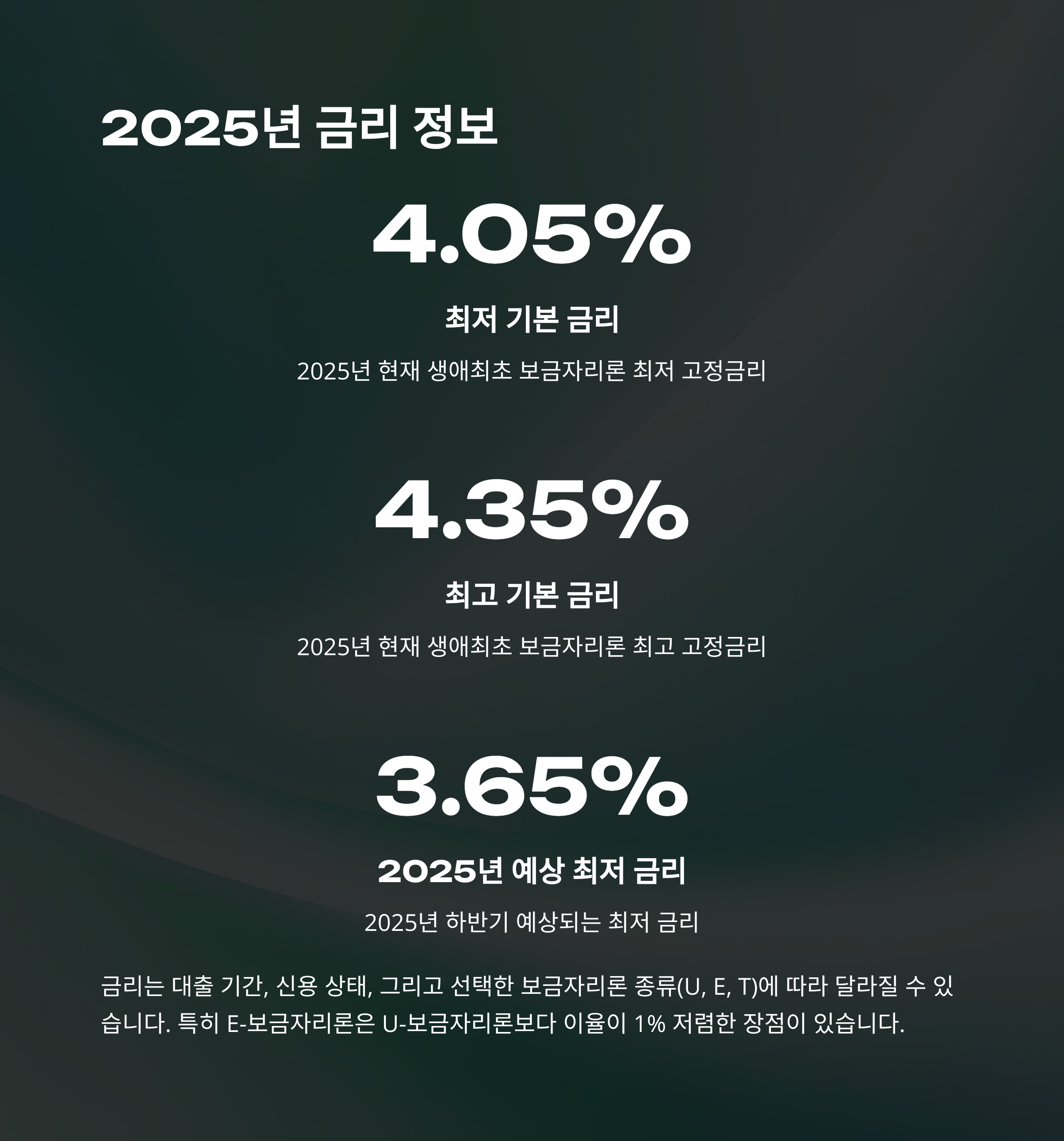 2025년 현재 생애최초 보금자리론의 고정금리는 연 3.65% ~ 3.95%로 유지되고 있습니다. 이는 기존의 일반 보금자리론보다 다소 낮은 수준인데요, 특히 E-보금자리론을 선택하면 U-보금자리론 대비 금리를 1% 더 저렴하게 적용받을 수 있어요. 금리는 대출기간과 신청인의 신용도, 선택한 상품 유형(U, E, T)에 따라 달라질 수 있으니 반드시 사전 시뮬레이션을 통해 확인해보세요.