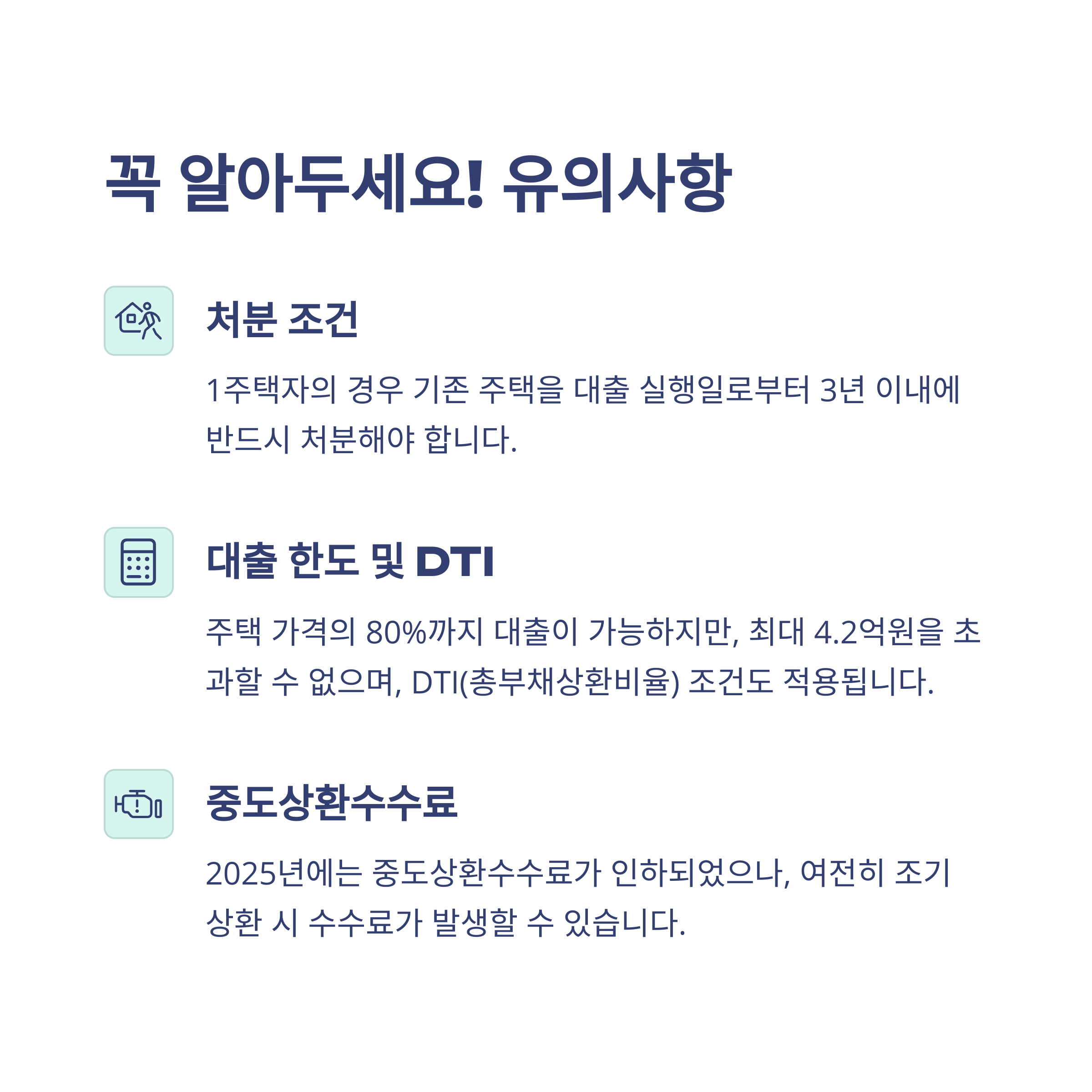 - 중도상환수수료는 2025년 인하되었지만 여전히 일부 존재