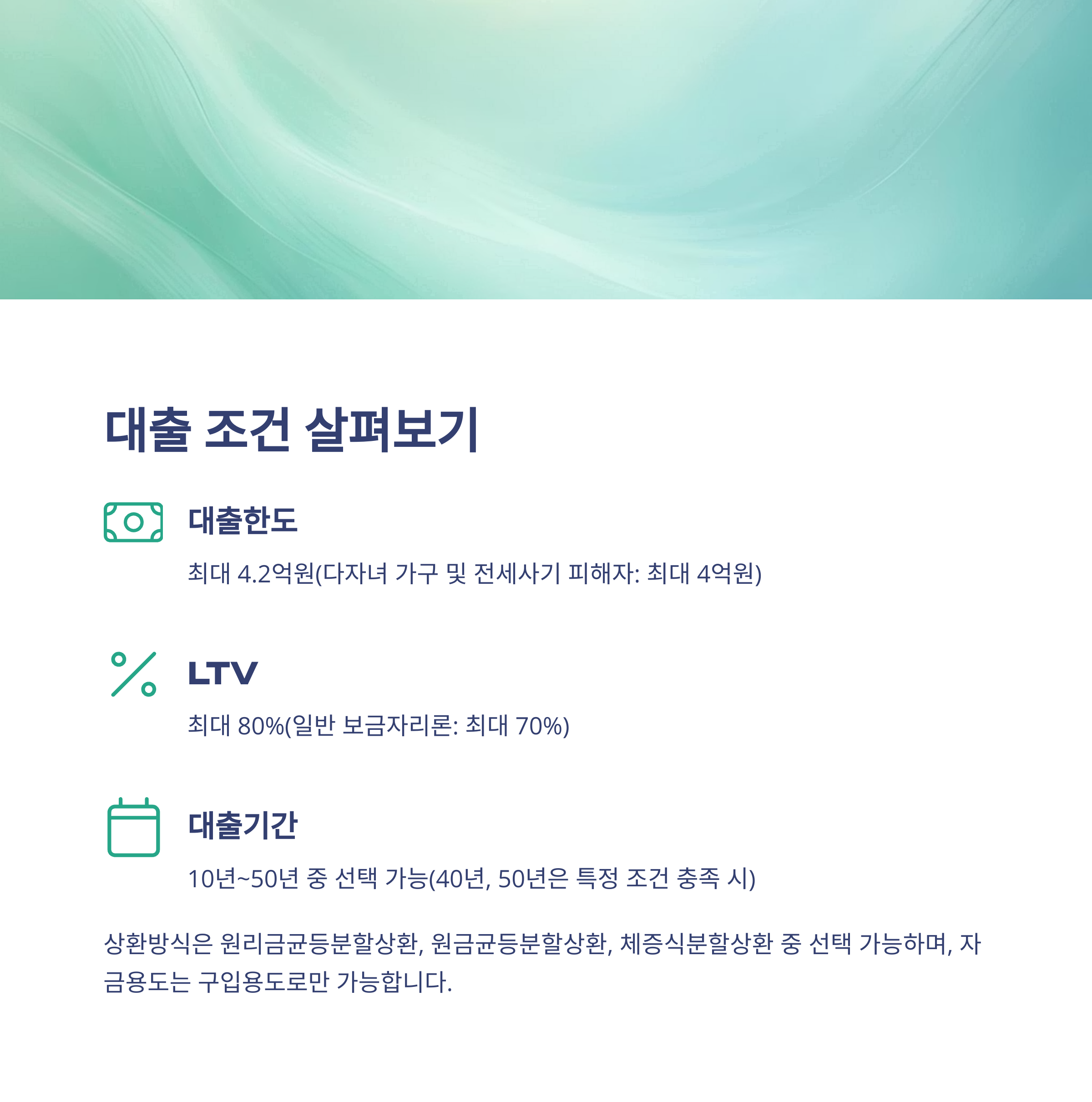 - 대출한도는 최대 4.2억원 또는 주택가액의 80% 이내