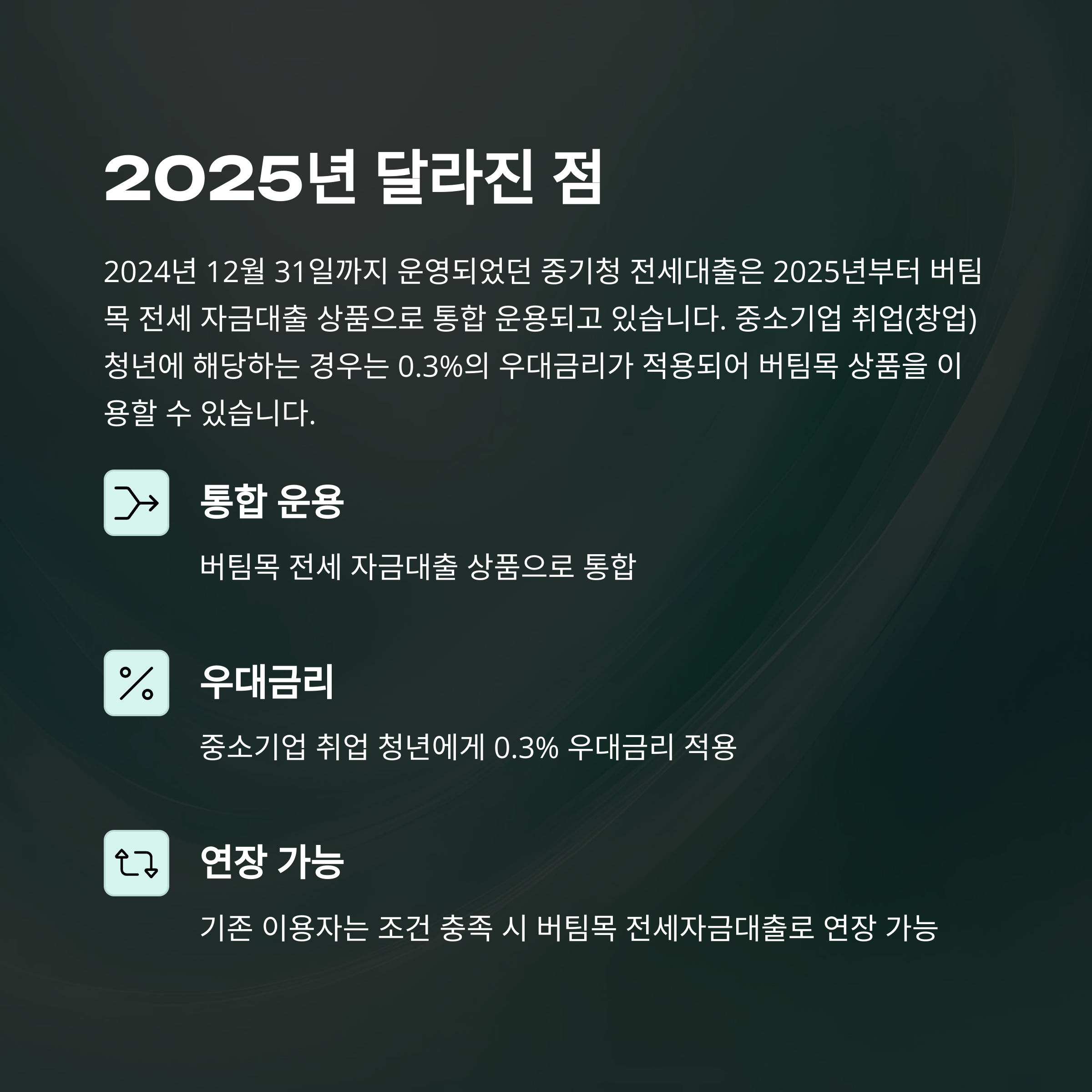 2025년부터는 ‘버팀목 전세자금대출’로 통합되었지만, 중소기업 재직 청년에게는 우대금리가 그대로 적용됩니다.