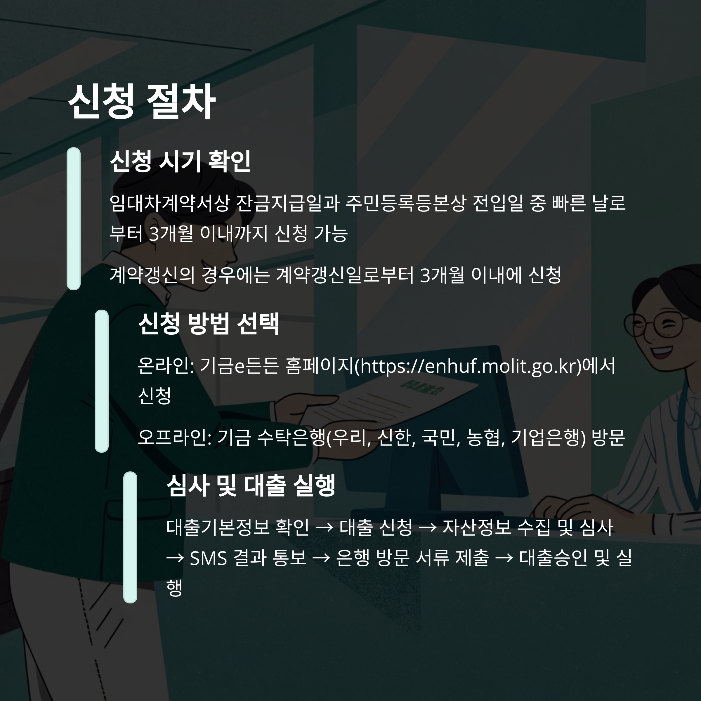신청은 기금e든든 홈페이지 또는 5개 시중은행에서 가능해요. 신청 시점은 임대차계약 잔금일 또는 전입일 기준 3개월 이내여야 하고요. 서류는 꽤 많지만, 미리 준비해두면 한 번에 처리할 수 있어요.