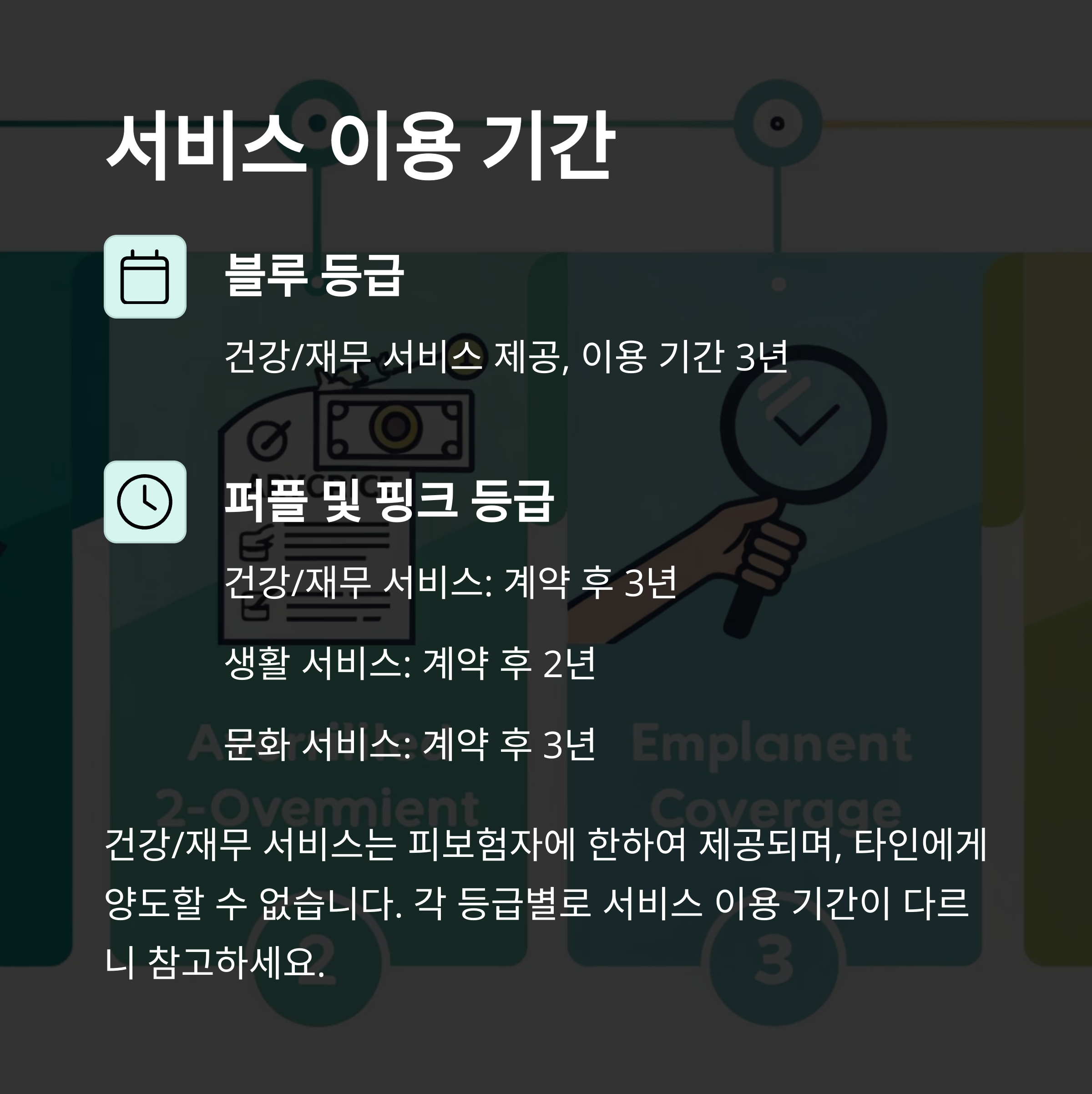 생활/문화 서비스는 피보험자뿐 아니라 계약자도 이용할 수 있으며, 타인에게 양도도 가능합니다.