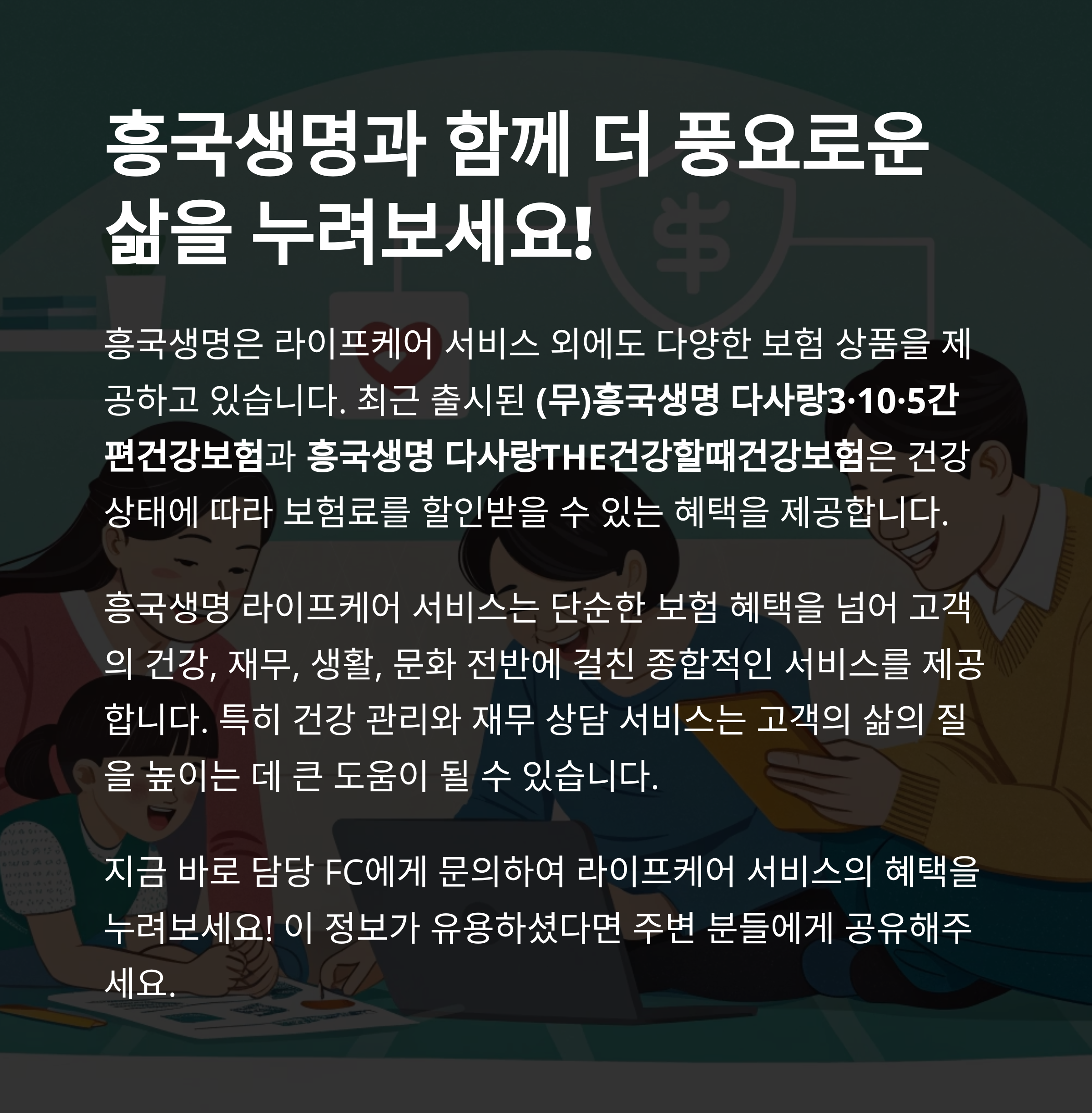 보험, 라이프케어, 흥국생명, 건강상담, 재무설계, 문화서비스, 생활편의, 시니어보험, 가족보장, 보험혜택