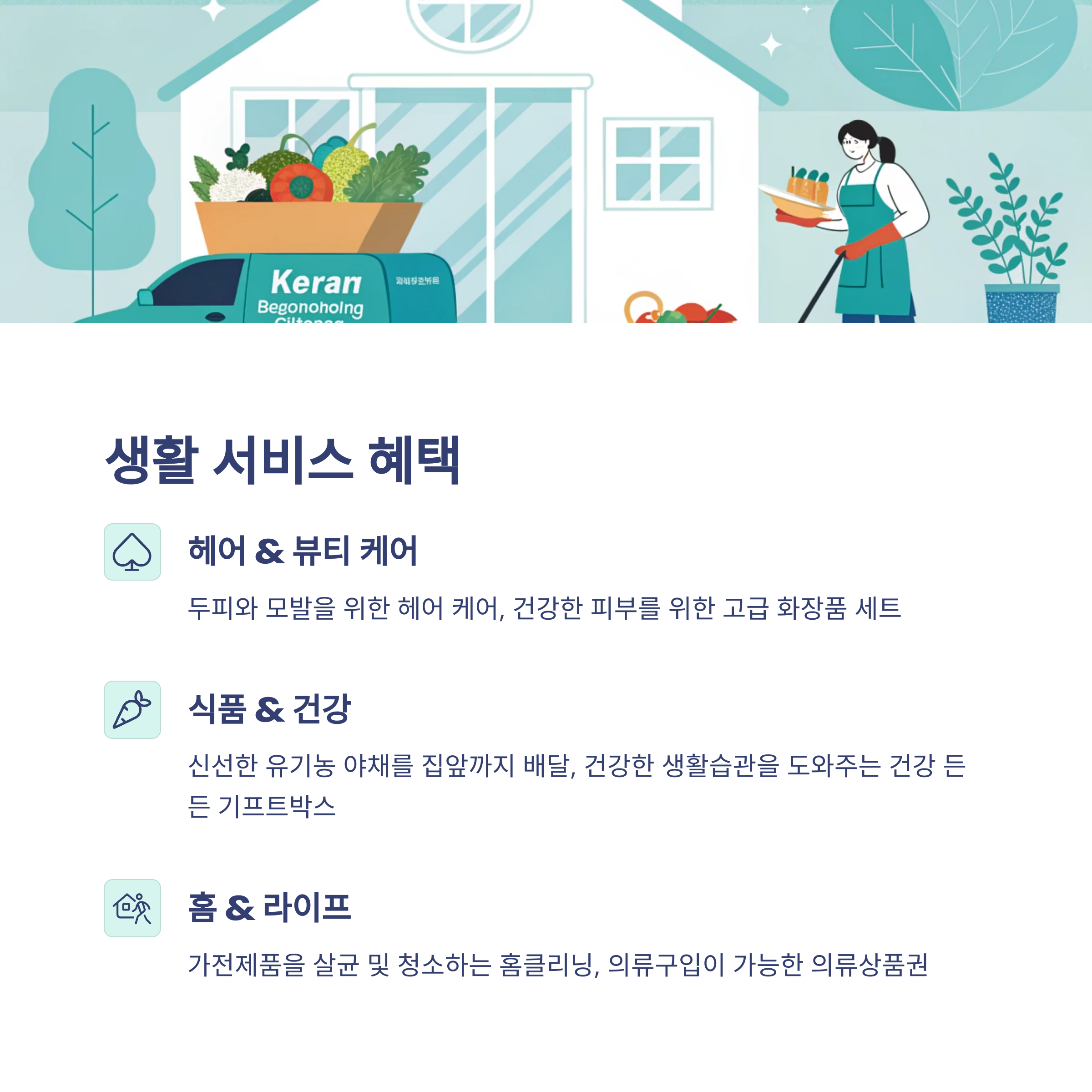 생활 서비스 헤어·스킨케어, 홈클리닝, 유기농 채소 배달, 화장품 세트, 건강 기프트박스