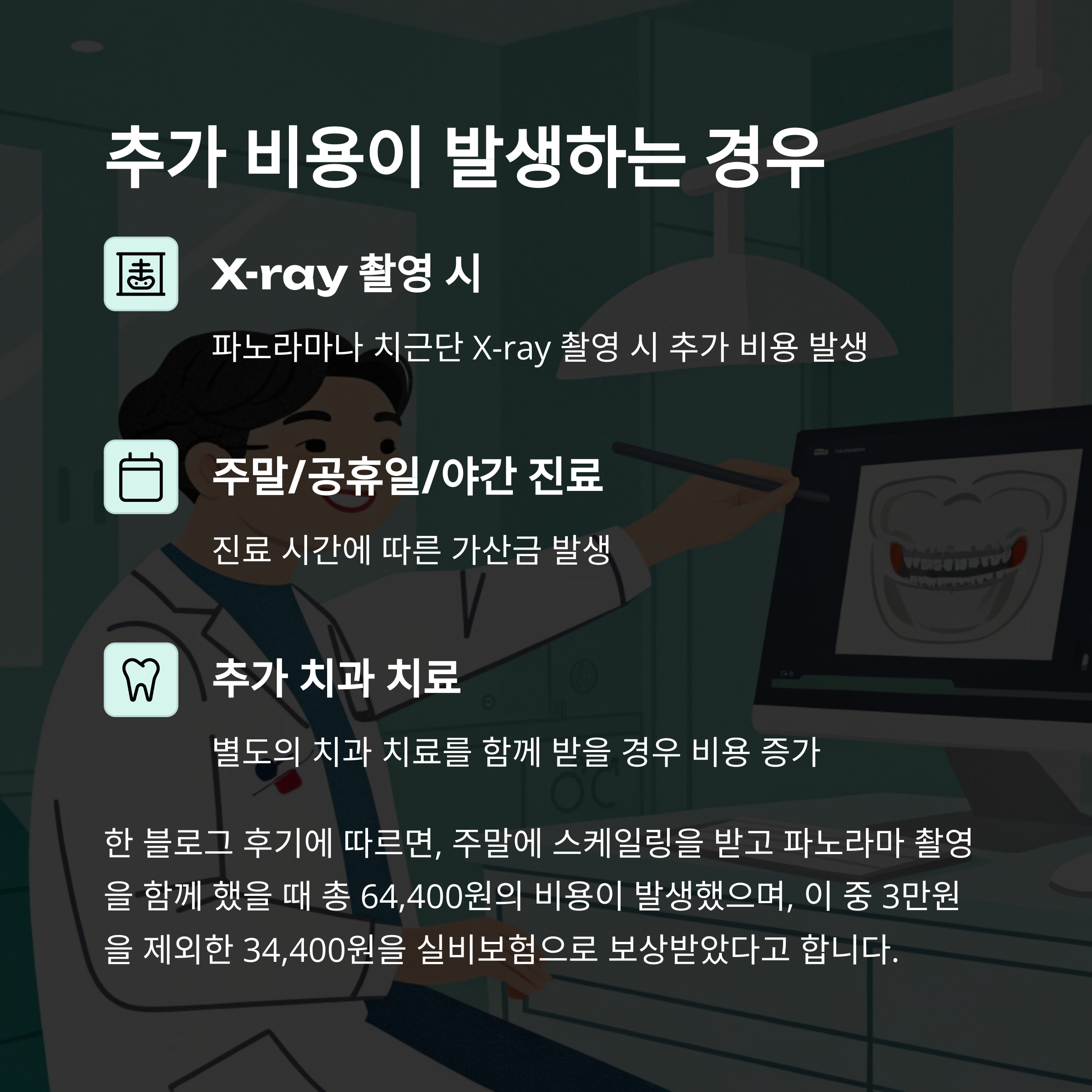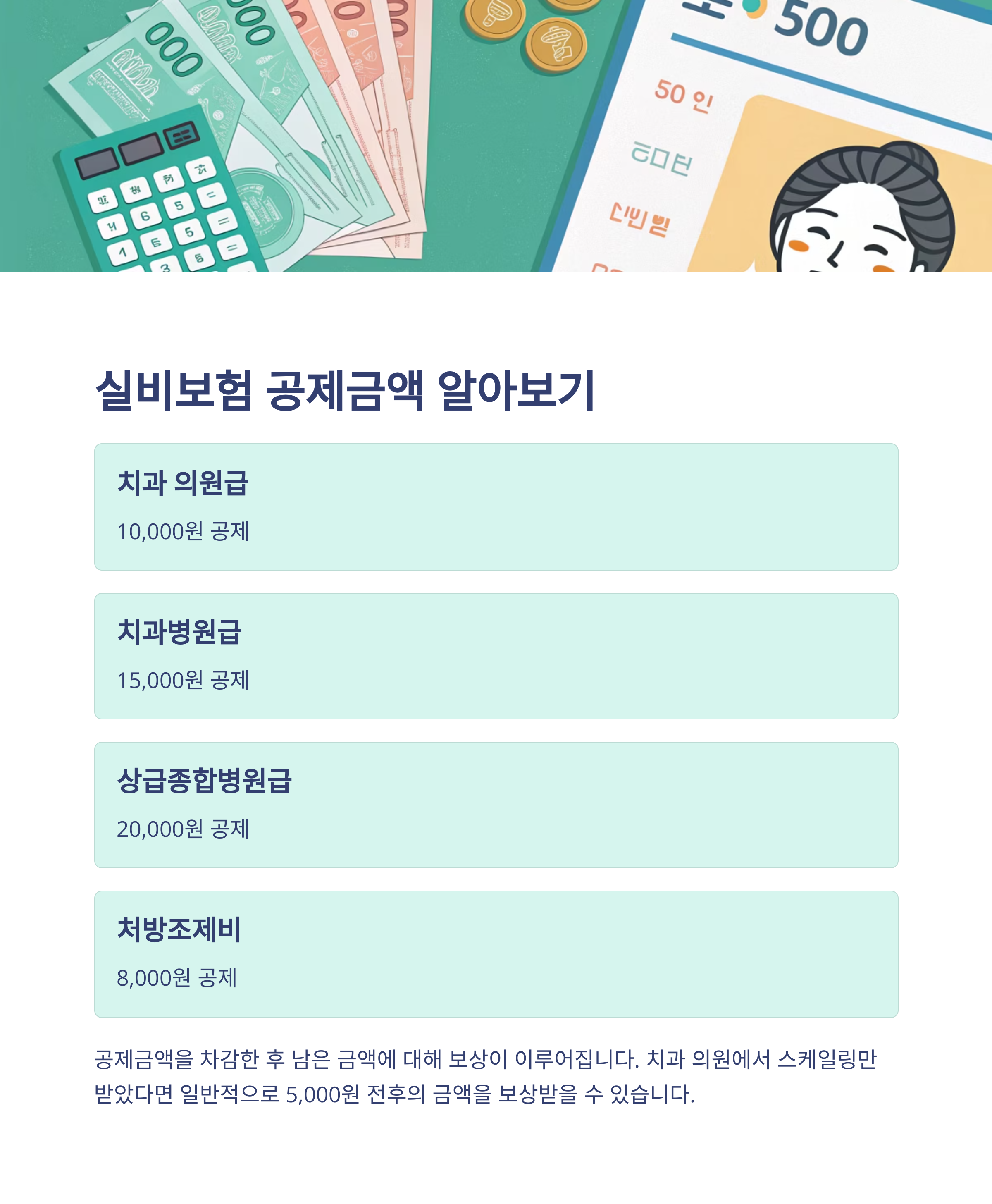 치과 의원 기준 공제 1만 원을 제외한 금액만 보상되며, 스케일링만 받을 경우 5천 원 내외가 일반적입니다.