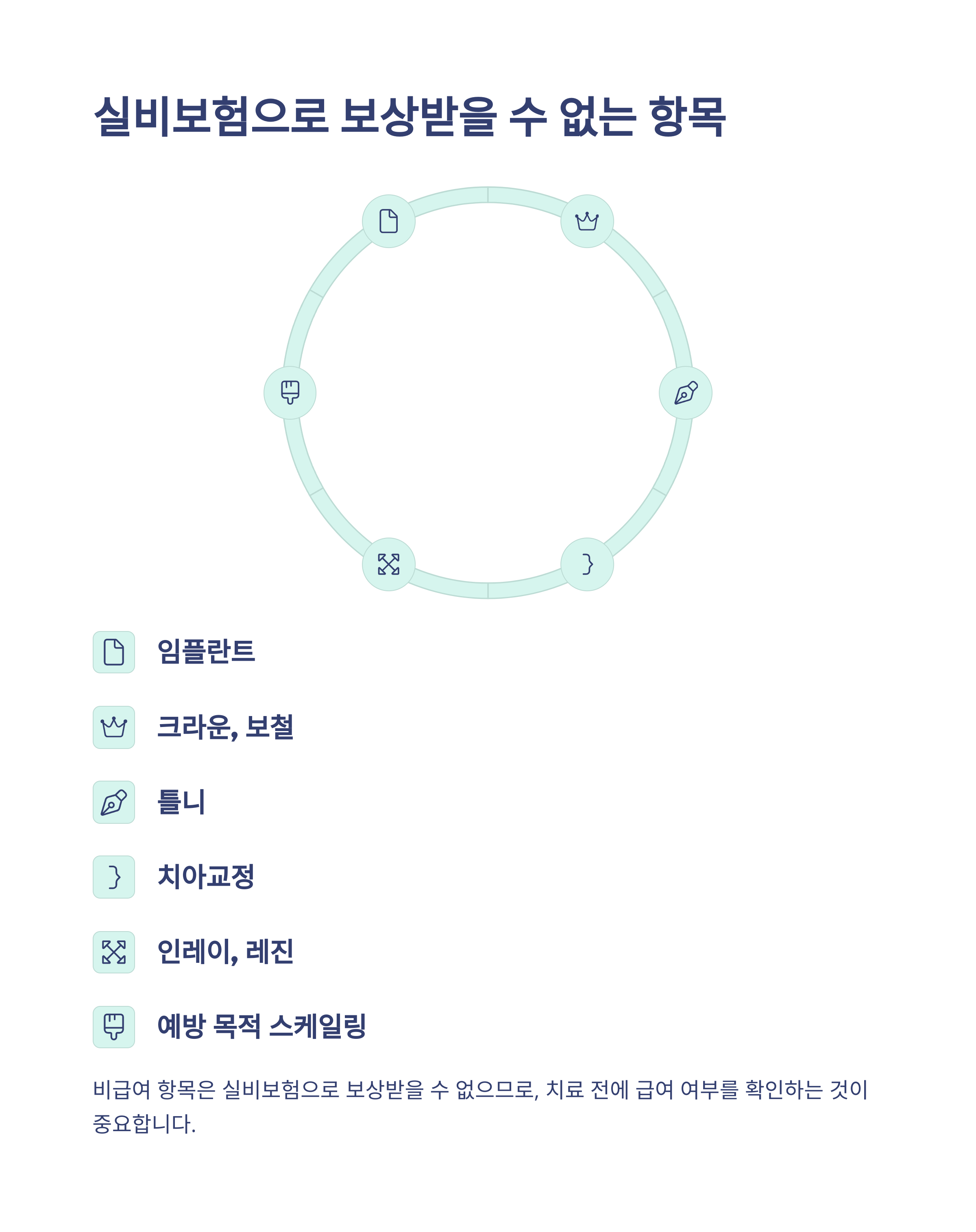 실비보험은 급여항목에 대해서만 보상이 가능하며, 임플란트나 레진, 인레이 등 비급여 항목은 제외됩니다.