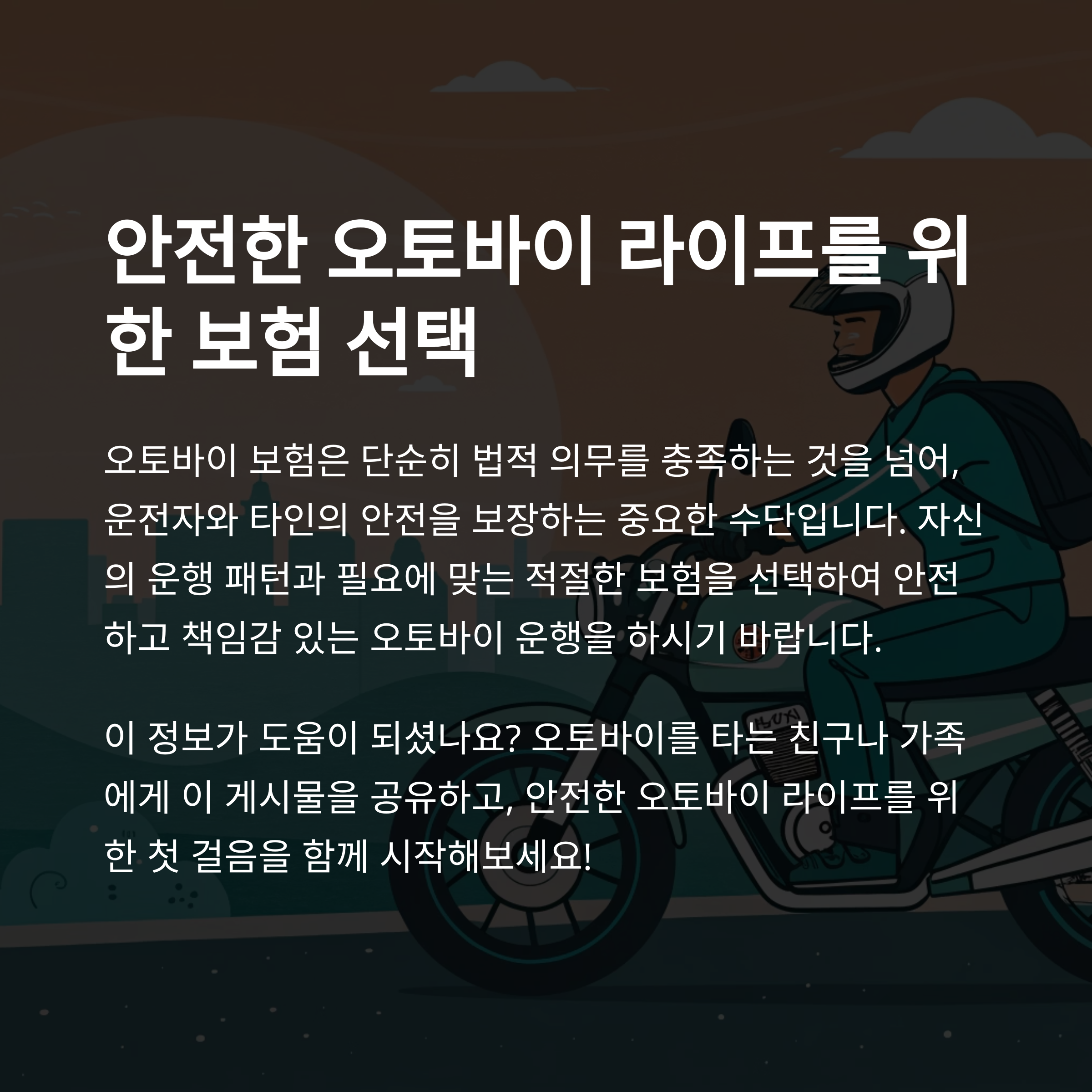 오토바이 보험은 단순히 의무를 넘어, 여러분과 타인의 안전을 지키는 중요한 수단입니다. 용도와 연령에 따라 달라지는 보험 조건들을 잘 파악하고, 가성비 좋은 상품을 선택하는 것이 관건이에요. 저도 처음엔 복잡했지만, 이렇게 정리하고 나니 한결 수월하더라고요. 여러분도 이 글을 바탕으로 나에게 딱 맞는 오토바이 보험을 찾아보시길 바랍니다. 혹시 보험 가입하면서 헷갈렸던 점이 있다면 댓글로 공유해주세요. 우리 함께 더 안전한 이륜차 문화를 만들어가요!