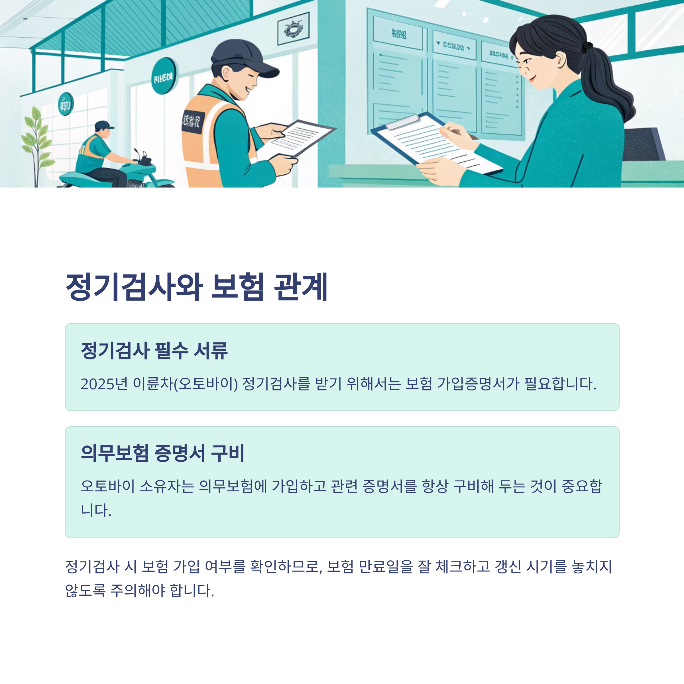 2025년부터는 이륜차 정기검사를 받으려면 반드시 보험가입증명서를 제출해야 해요. 그러니 보험 가입은 단순히 안전 문제나 법적 의무를 넘어, 검사를 위한 필수 요건이 되었죠.