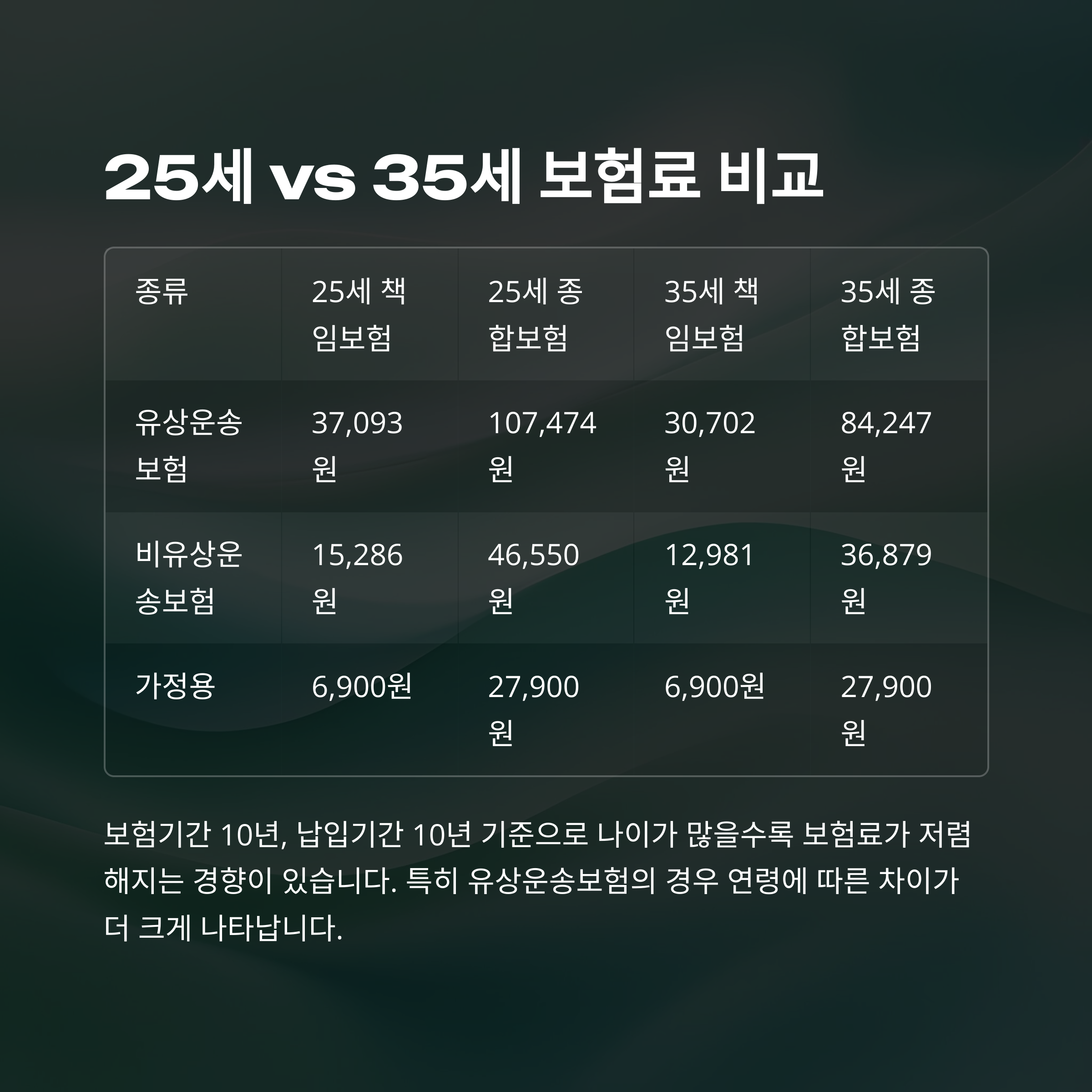 자, 이제 실제 보험료가 얼마나 다른지 볼까요? 보험료는 나이, 용도, 그리고 보험 종류에 따라 크게 달라집니다.