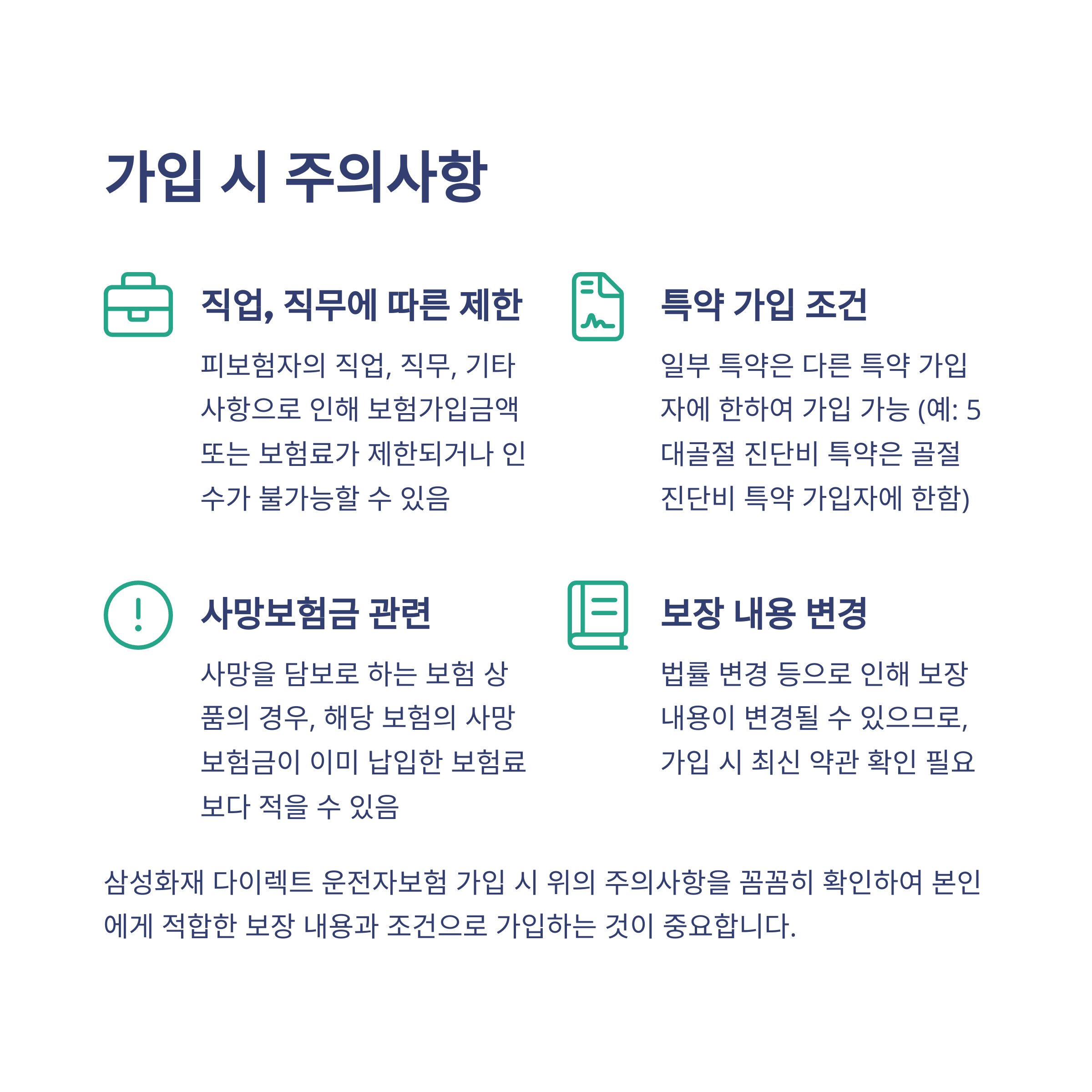 운전자보험은 가입 전에 반드시 확인해야 할 조건들이 있습니다. 특히 삼성화재 다이렉트 상품의 경우, 온라인 전용이다 보니 약관 확인은 본인이 직접 꼼꼼히 해야 해요. 아래 주의사항 꼭 체크하세요!