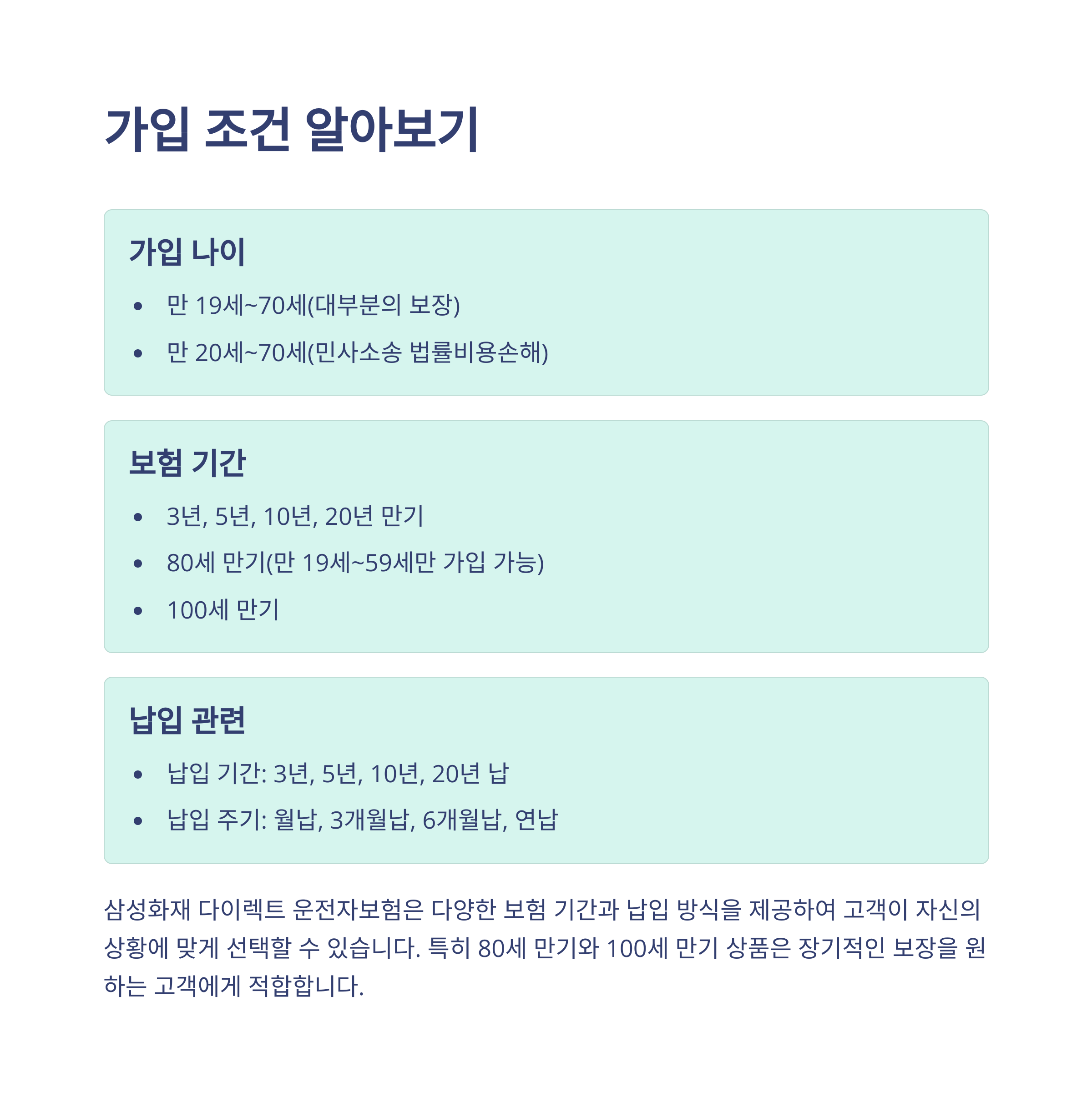 삼성화재 다이렉트 운전자보험은 만 19세부터 가입 가능하며, 일부 특약(예: 민사소송 법률비용)은 만 20세 이상부터 가입이 가능합니다. 보험 기간은 3년부터 100세 만기까지 다양하게 설정할 수 있고, 납입 주기도 월납, 3개월납, 6개월납, 연납 중 선택할 수 있어요.