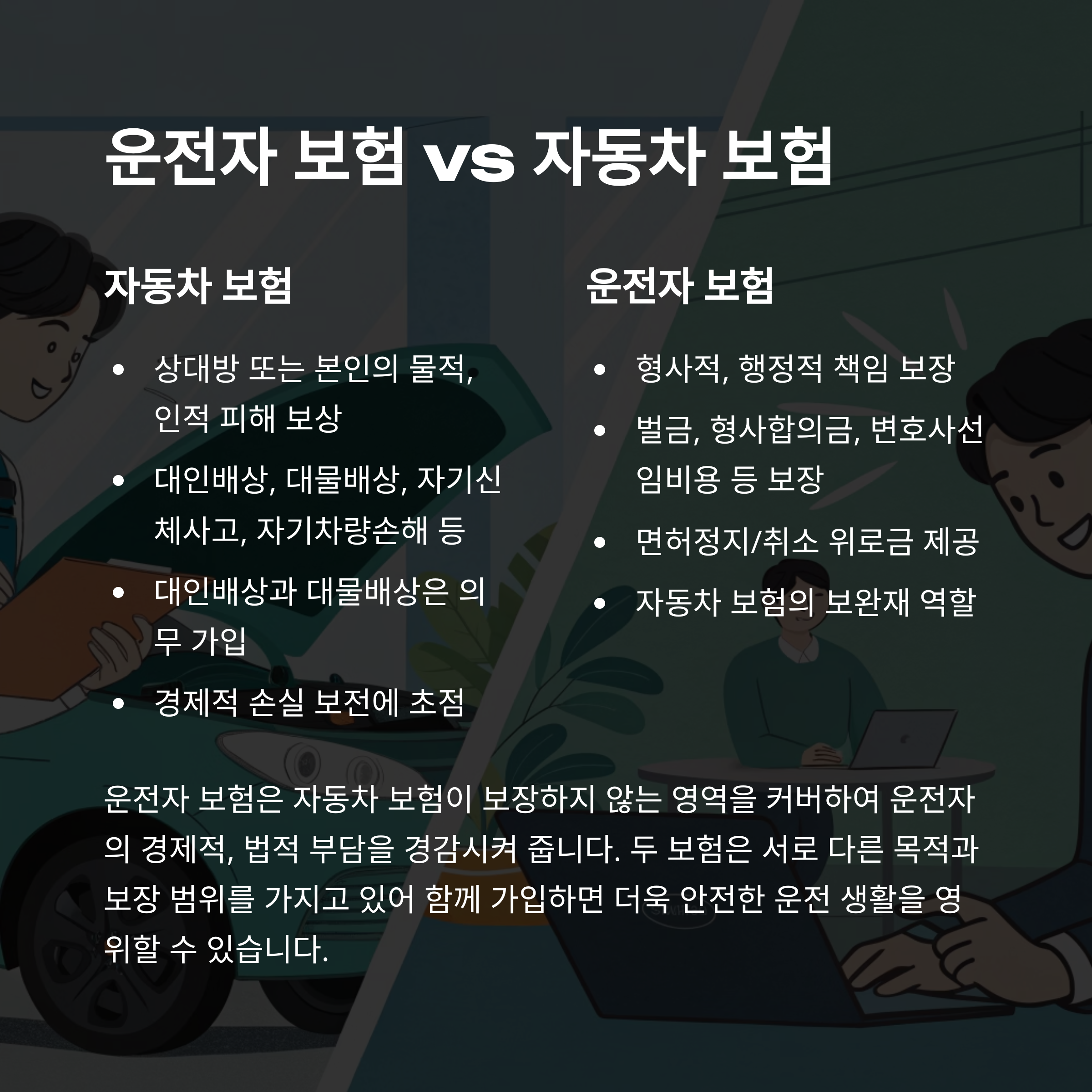 운전자 보험과 자동차 보험은 보장하는 목적 자체가 다릅니다. 자동차 보험은 사고로 발생한 상대방 손해나 내 차량 피해를 보장하는 반면, 운전자 보험은 운전자의 법적 책임을 보장해줍니다.