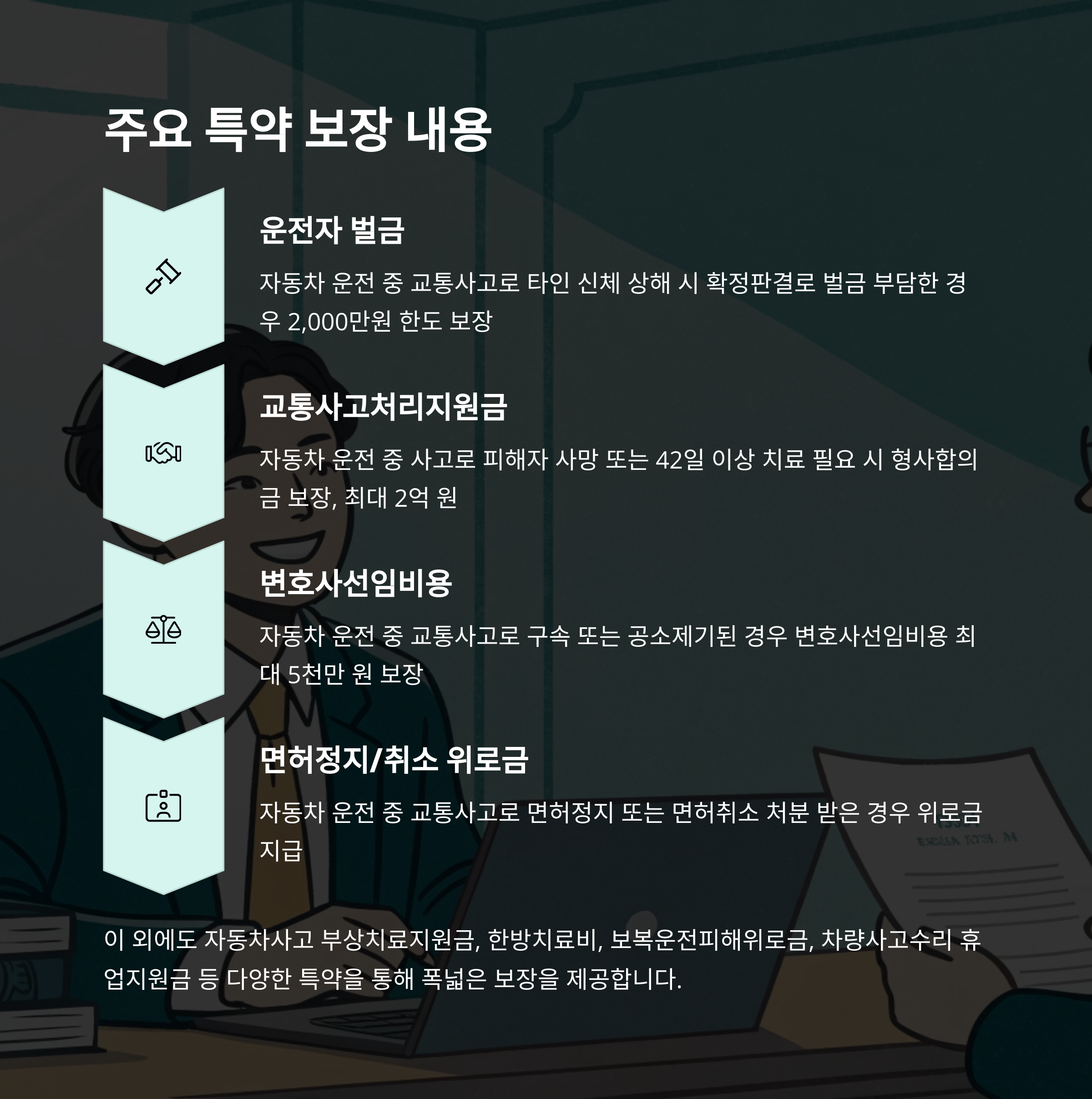 | 교통사고처리지원금 | 사망 또는 중상해 시 형사합의금 최대 2억원 보장 |