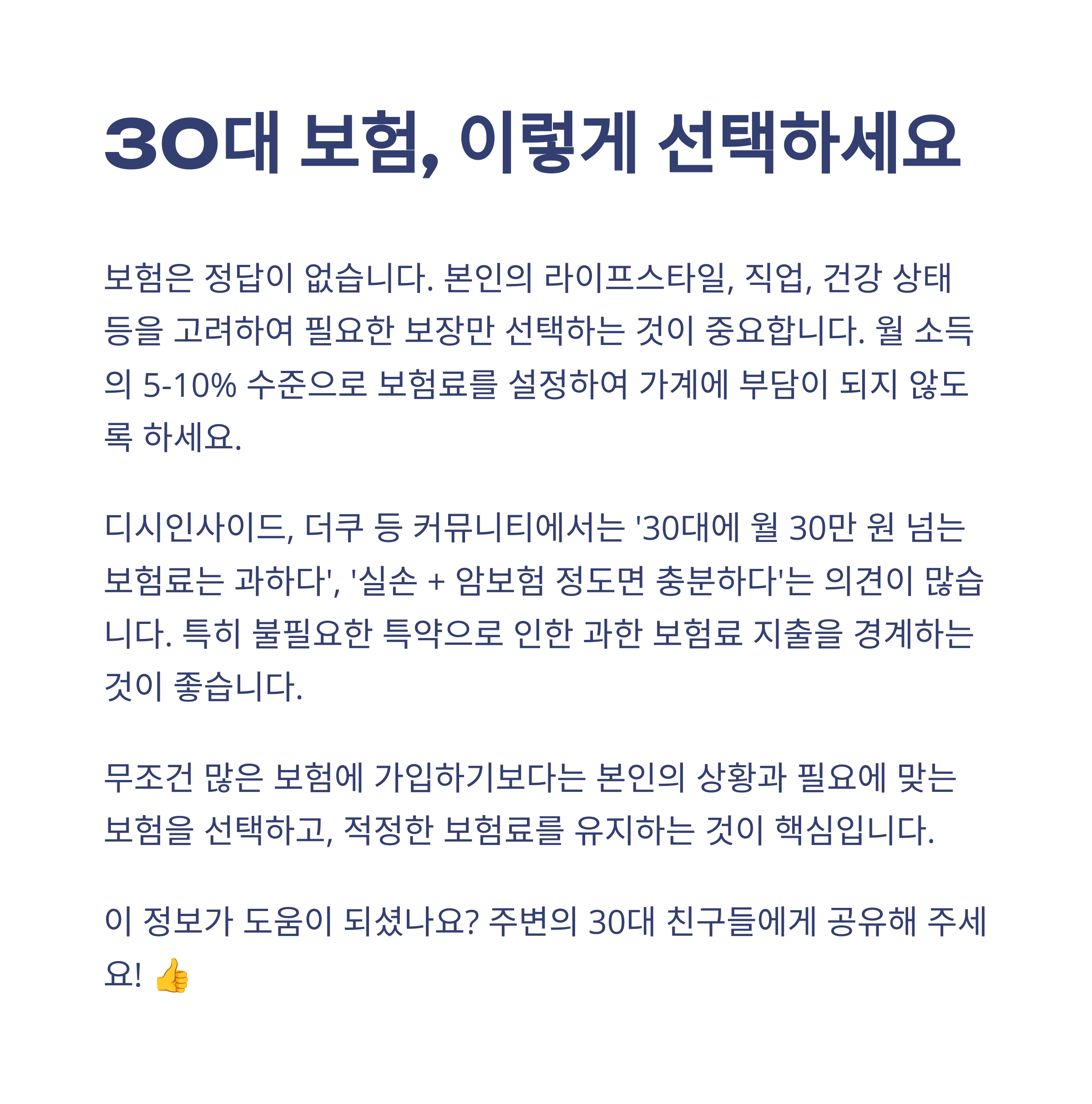 이제 여러분도 30대 평균 보험료가 대체 어느 정도 수준인지, 또 어떤 방향으로 보험을 구성해야 할지 조금 감이 오셨을 거예요. 저도 처음엔 무턱대고 가입했다가 나중에 리모델링하느라 진땀 좀 뺐거든요. 보험은 내 미래와 가족을 위한 준비인 만큼, 가볍게 생각할 문제는 아니지만 그렇다고 너무 무겁게 느낄 필요도 없답니다. 내 상황에 맞게, 과하지 않게, 현명하게 보험을 구성해보세요. 궁금한 점이 있다면 댓글로 남겨주시고, 여러분의 보험 꿀팁도 함께 공유해주시면 정말 감사할게요 :)