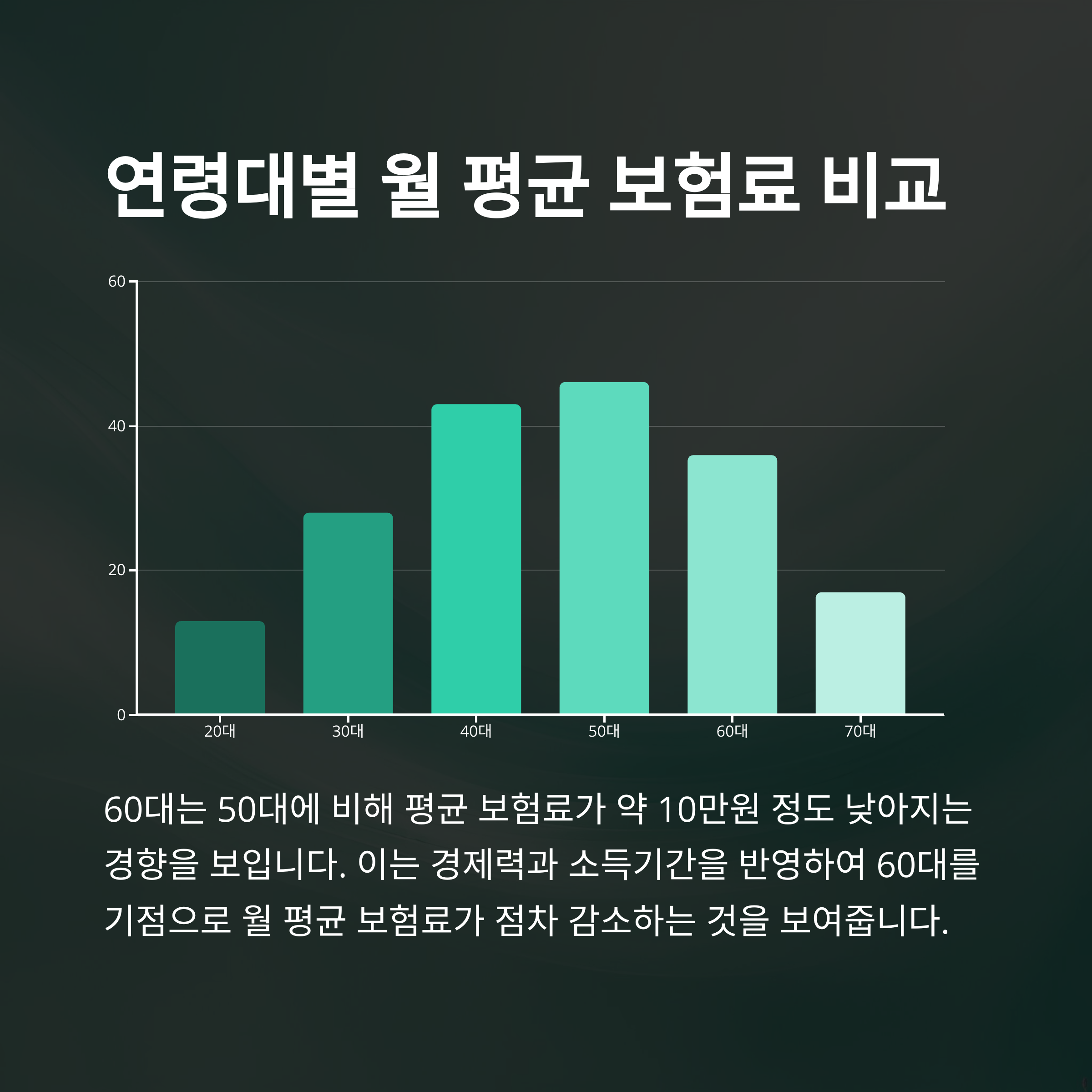2025년 현재, 60대의 월 평균 보험료는 약 36만 원 수준입니다. 이는 50대의 46만 원보다는 낮지만, 여전히 꽤나 큰 금액을 보험에 투자하고 있다는 걸 보여주죠. 연령대별 보험료를 보면, 40대와 50대를 기점으로 최고점을 찍고, 60대부터는 점차 줄어드는 경향을 보입니다. 이는 은퇴 이후 소득이 줄어드는 현실과도 맞물려 있겠죠.