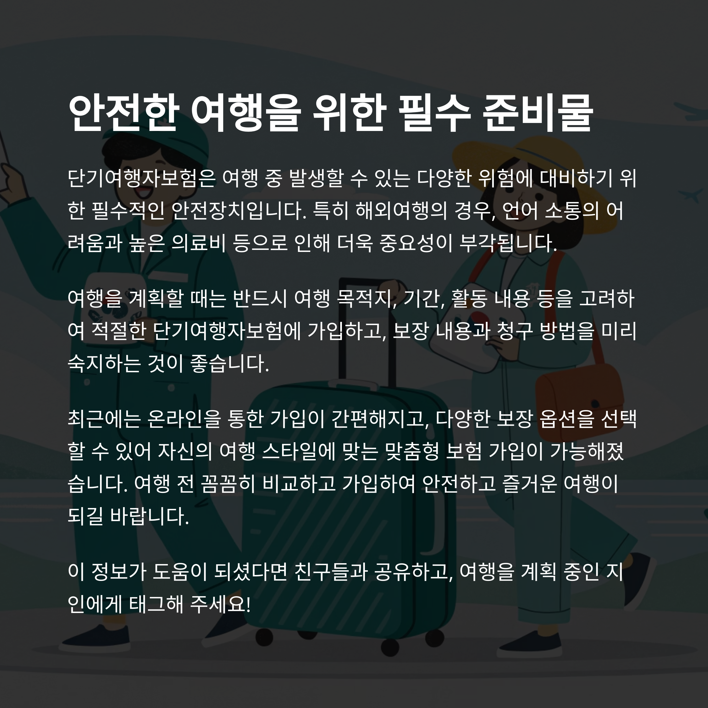 여행 가방은 쌌나요? 그렇다면 이제 '보험'도 챙기실 차례입니다. 짧지만 알찬 여행일수록 예상치 못한 일이 생기기 마련이거든요.