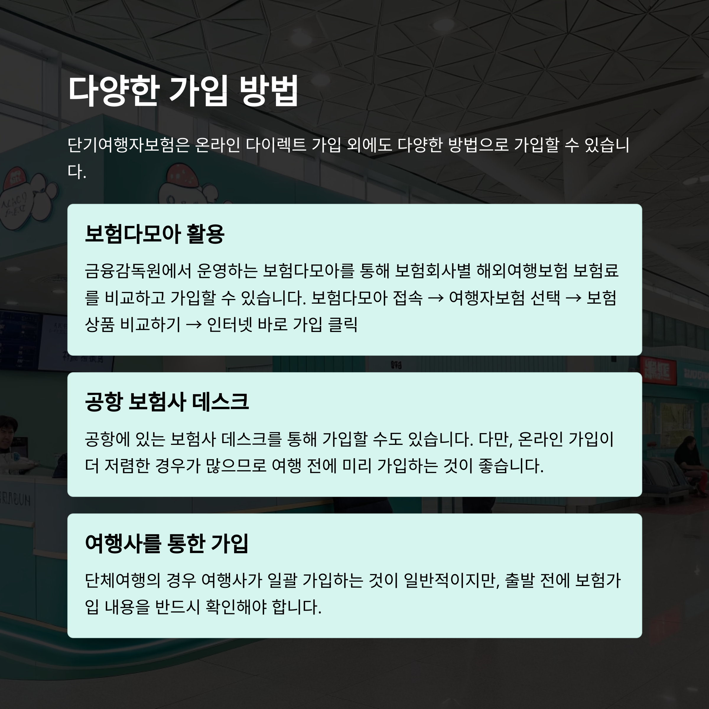 가입은 온라인으로 하면 가장 간편해요. 보험사 앱이나 웹사이트, 또는 금융감독원 '보험다모아'를 통해 한 번에 비교하고 가입도 가능하죠. 간혹 공항에서 데스크로 가입하는 분도 있는데, 그건 진짜 급할 때만!