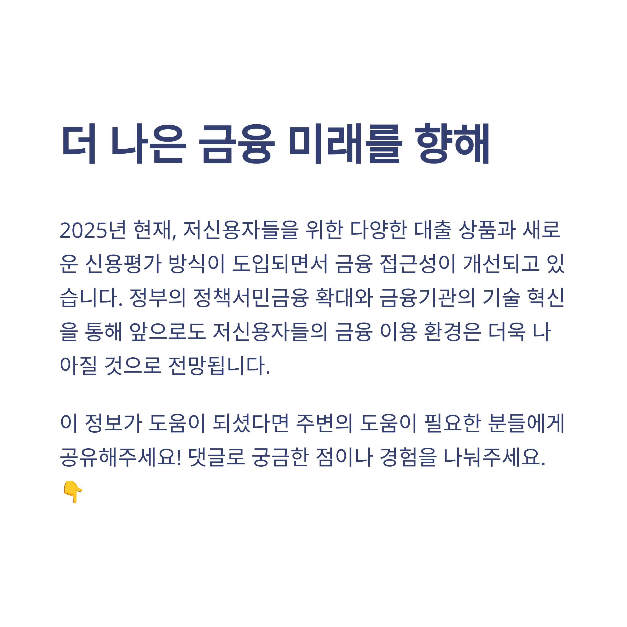지금까지 2025년 저신용자를 위한 대출 상품과 트렌드를 함께 살펴보았어요.