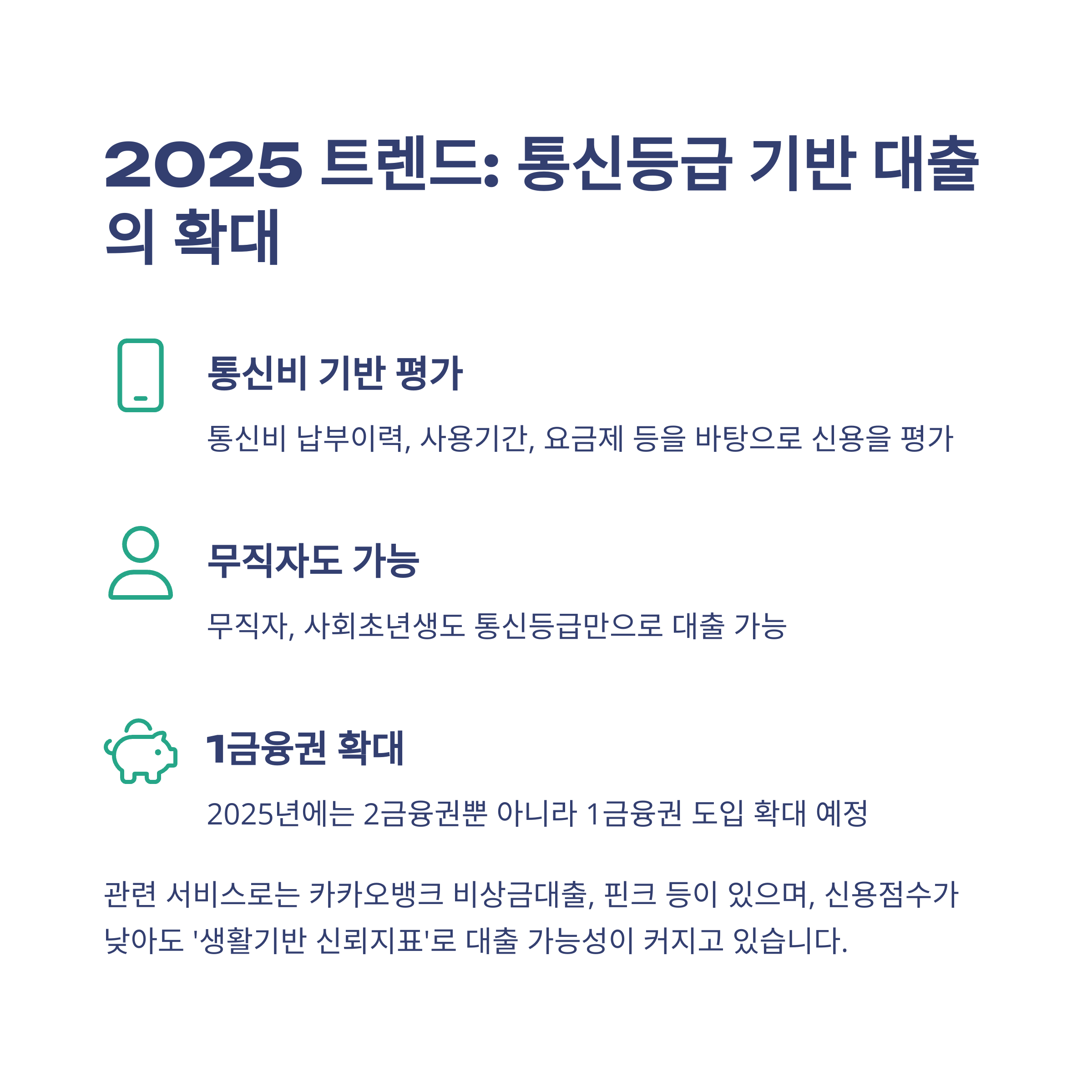 사회초년생, 무직자도 통신등급을 통해 1금융권까지 접근 가능해졌고, 카카오뱅크 비상금대출, 핀크 등 다양한 핀테크 서비스가 이를 도입 중이에요.