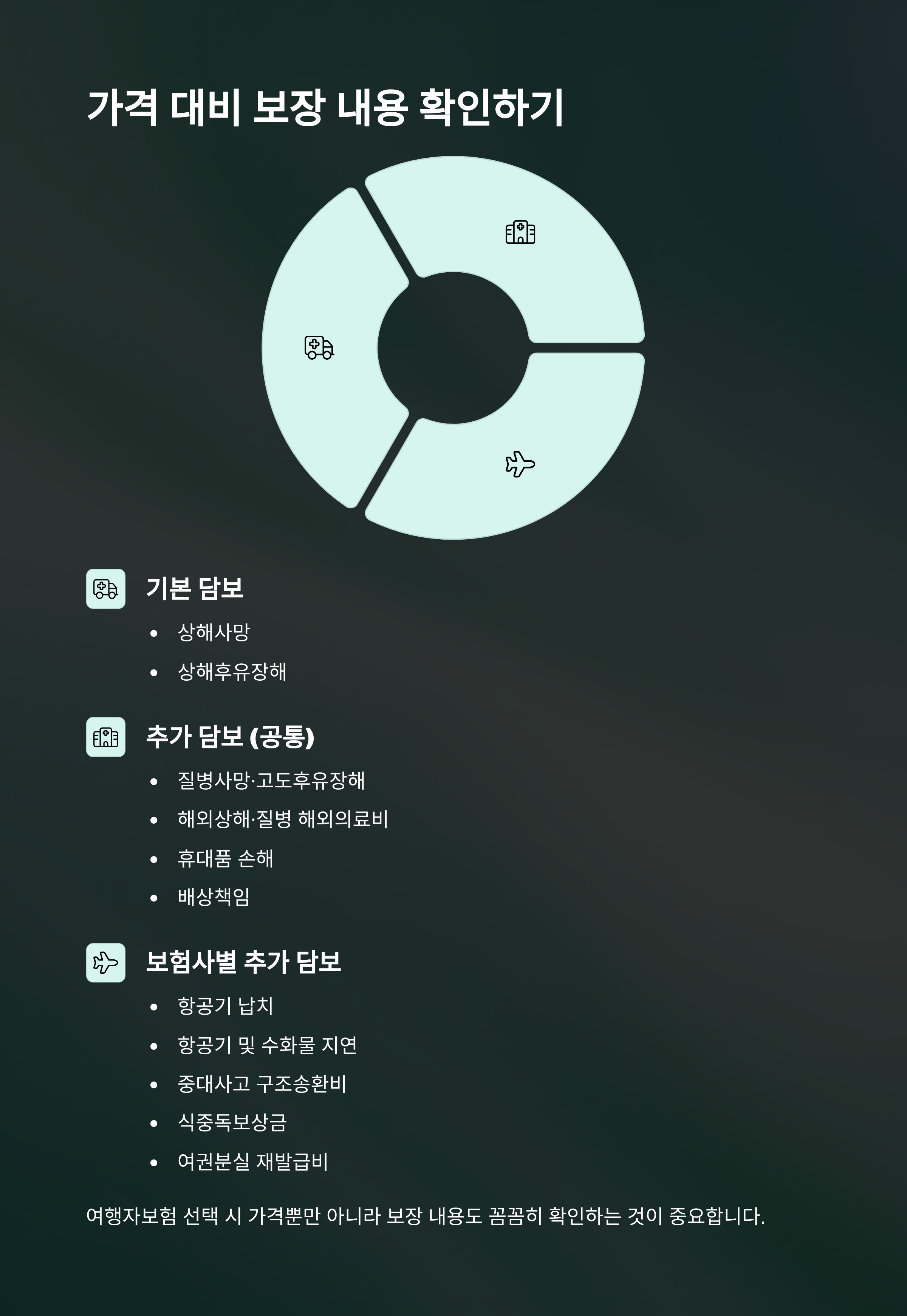- 휴대품 손해, 항공 지연 등 추가 보장 여부 체크